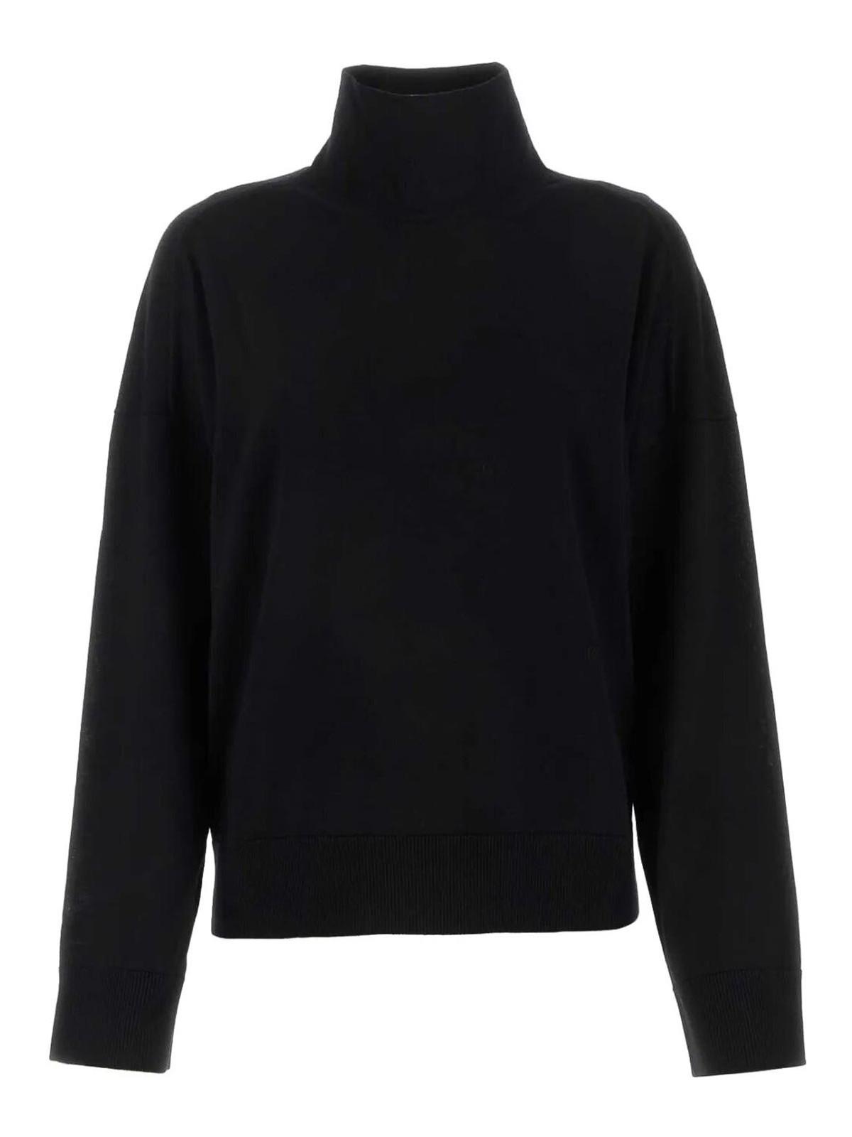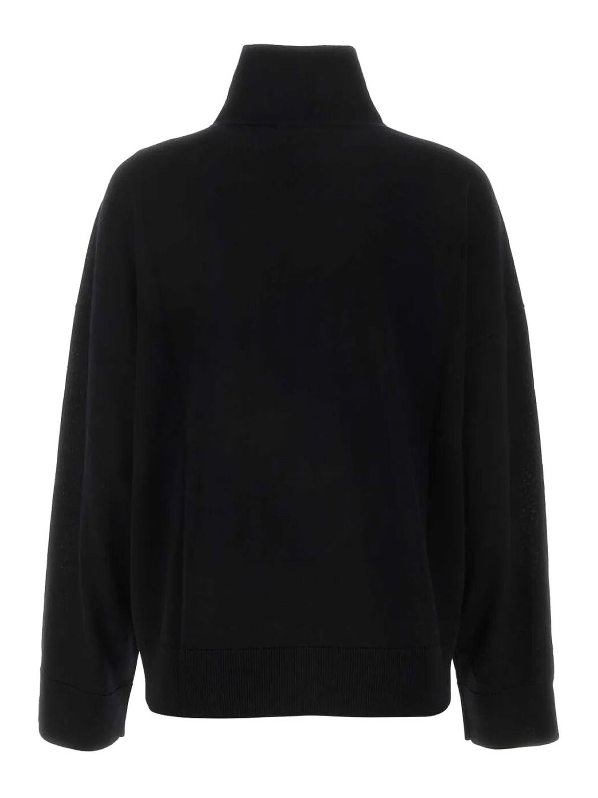 ブラックウール混紡ニット構造、ロゴ刺繍、ハイカラー、ロングスリーブ、ストレートヘム