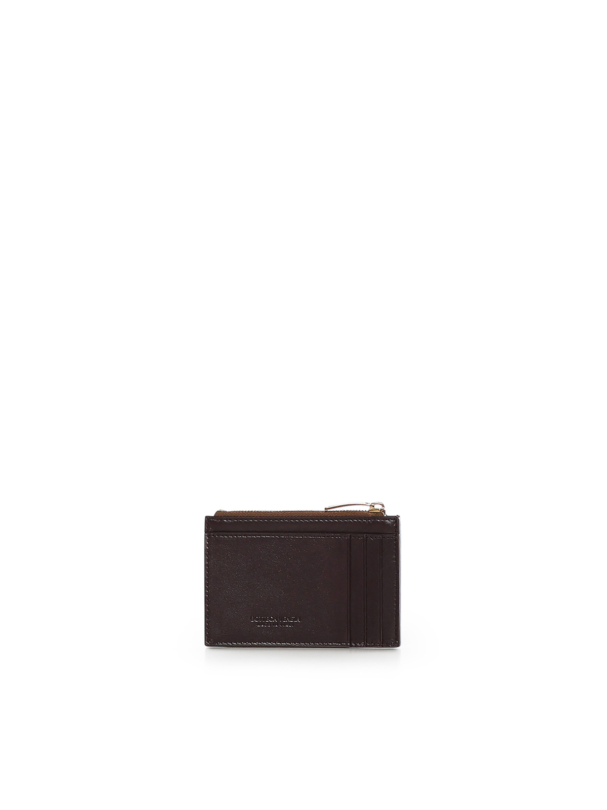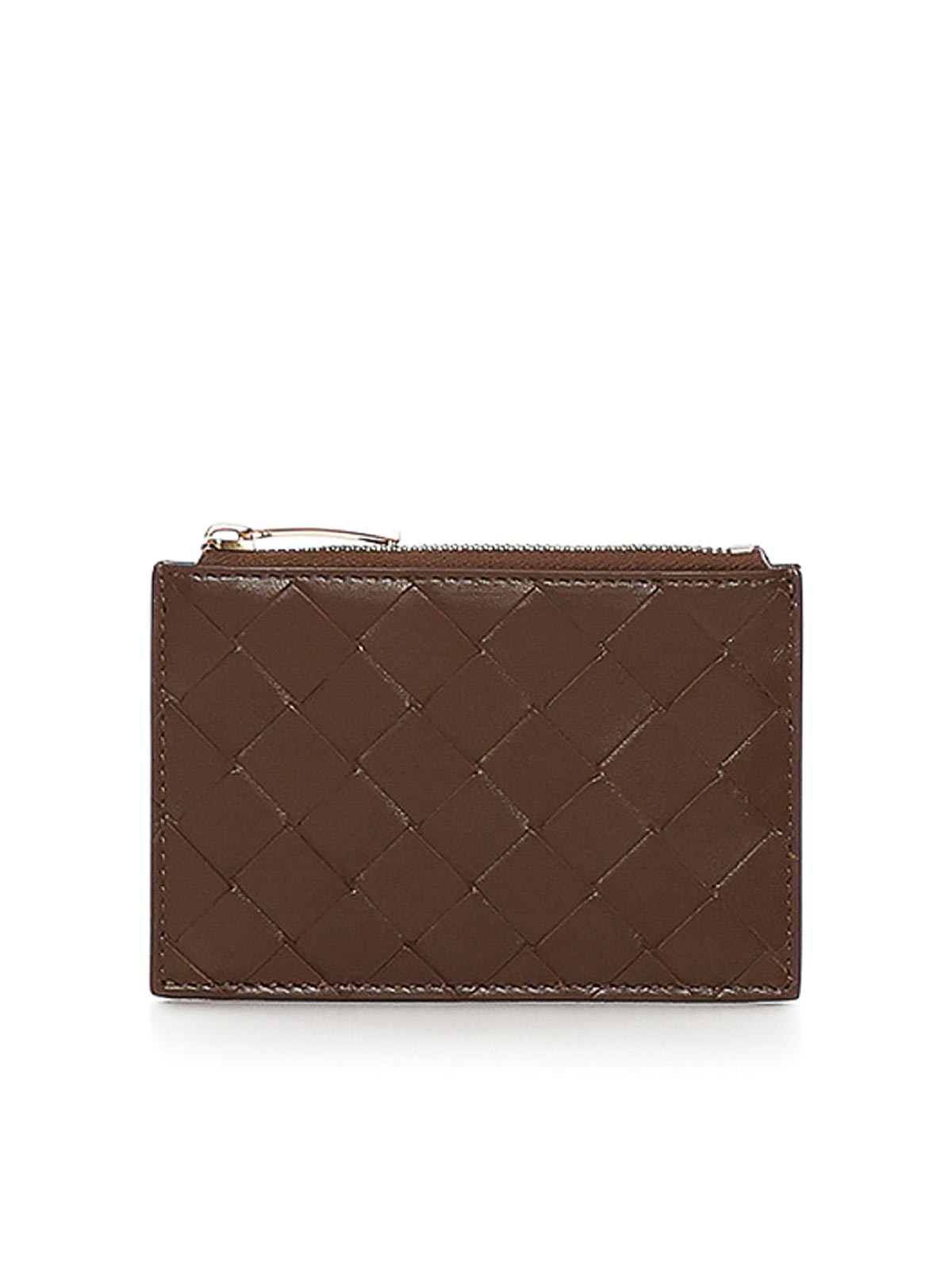 イントレチャート細工のナッパレザー製、ファスナー付き小銭入れ、イタリア製、寸法:12 x 8.2 x 0.5 cm、デザイナーカラー:ヘーゼルナッツ、ダークバローロ