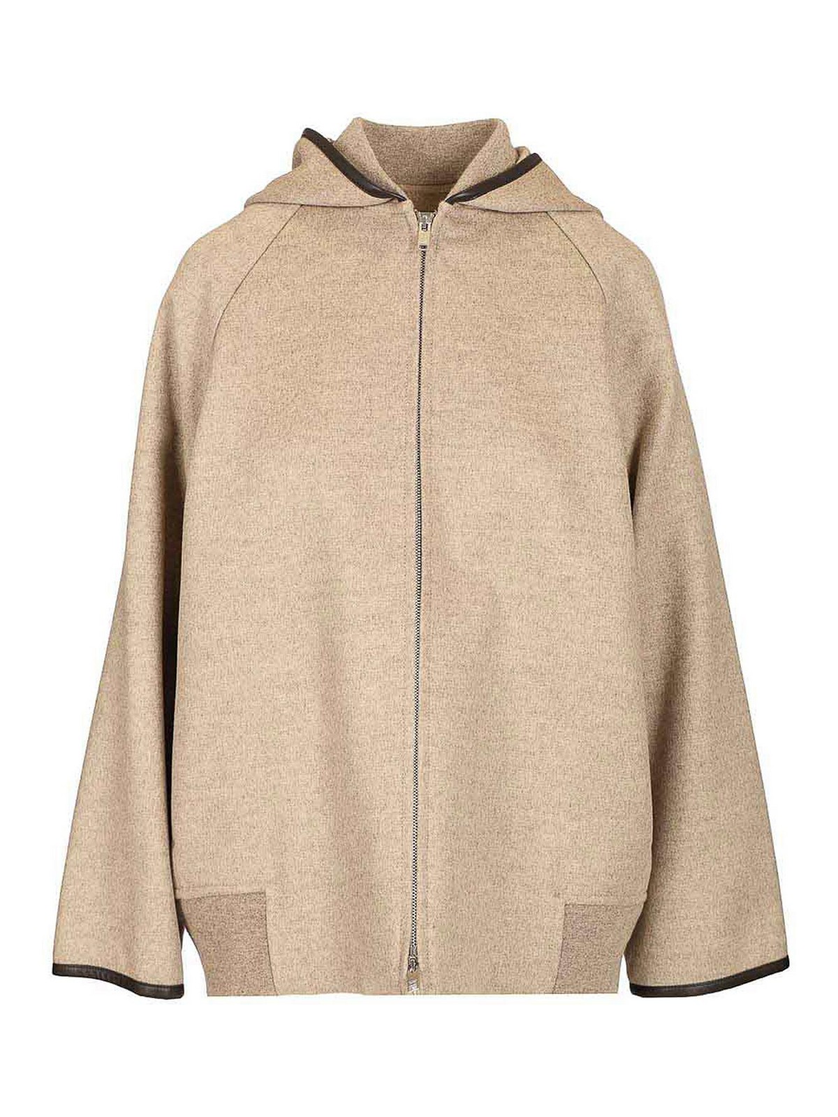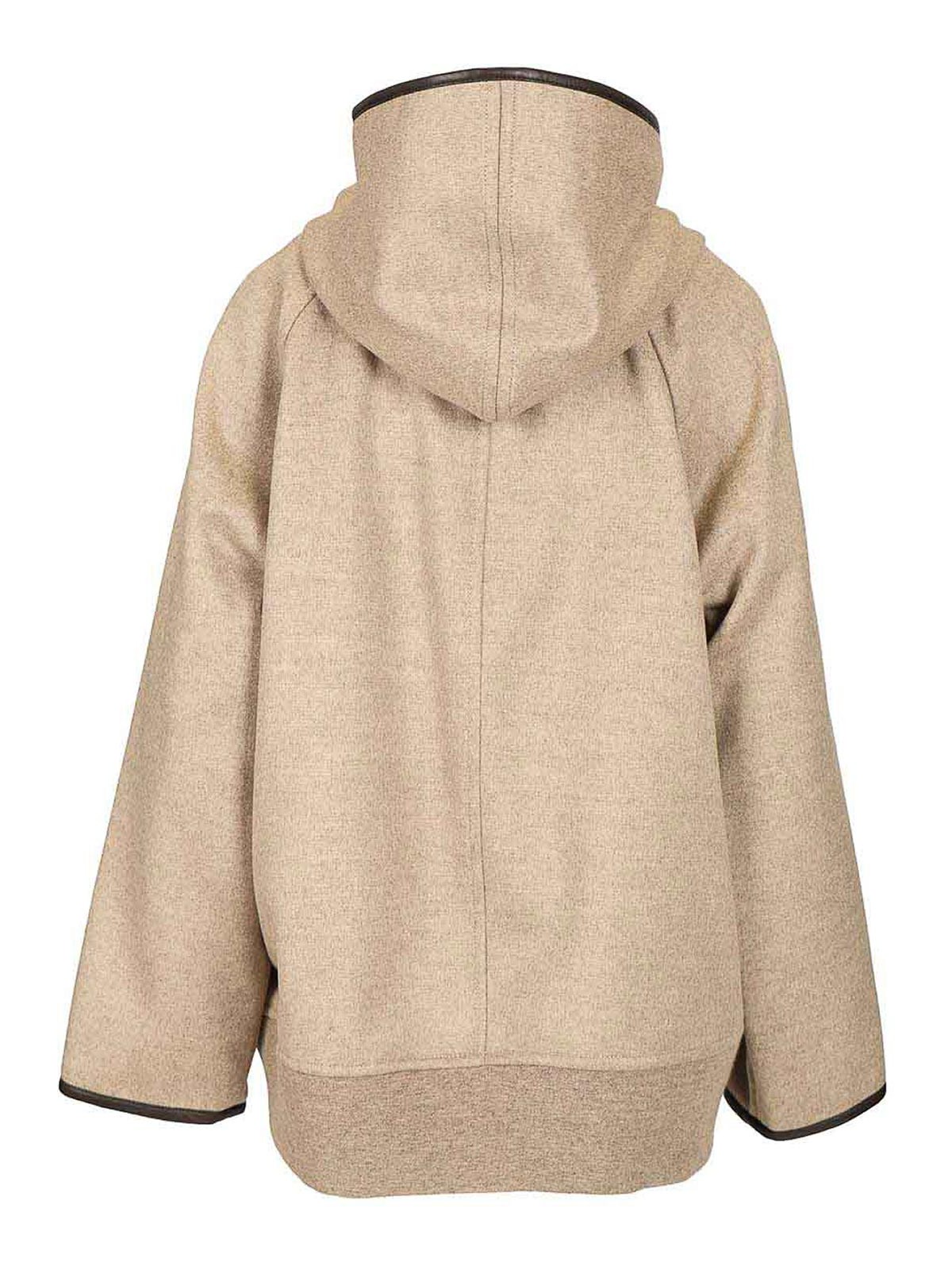 bottega venetaのダブルフェイスウールフード付きジャケット。レザートリム、ファスナー開閉、部分的に裏地付きのモデル、リラックスフィットが特徴です。