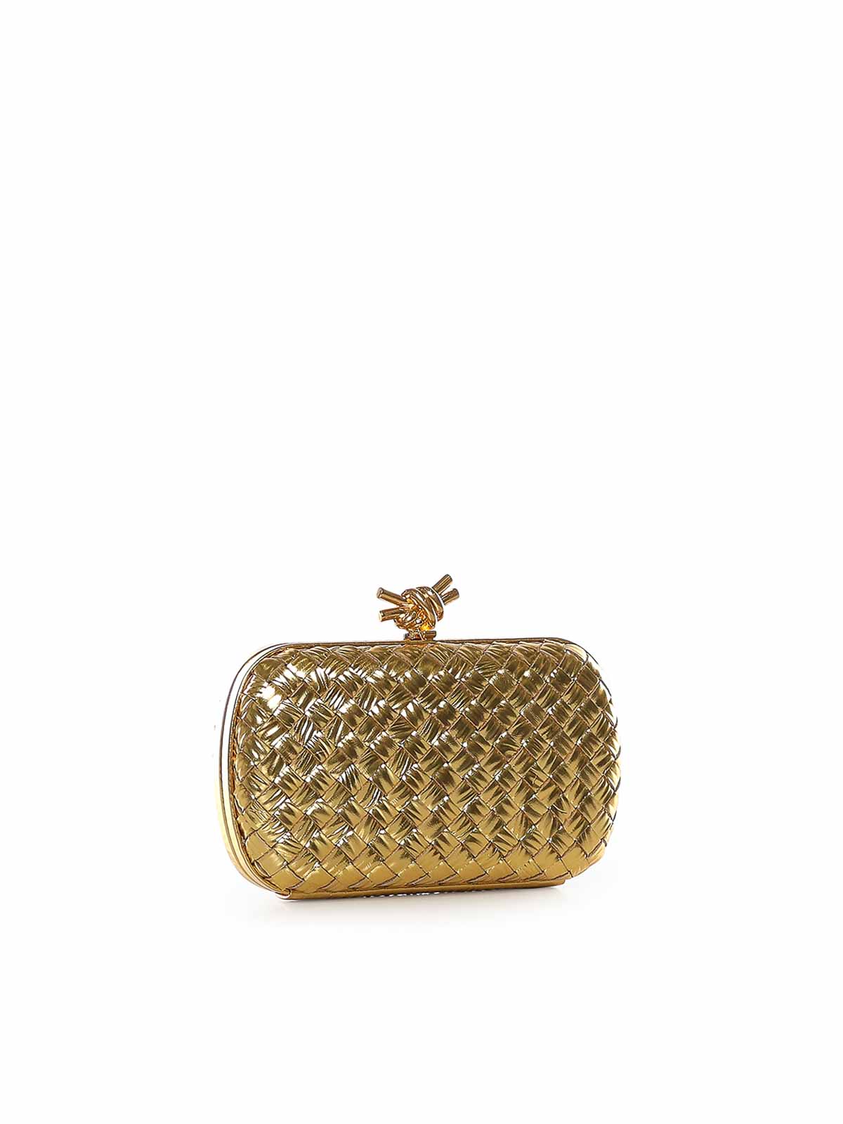 イントレシオ織りのラミネートカーフスキン製、メタルノットクロージャー、ラムスキン、寸法:19 x 11.5 x 5 cm、イタリア製、色:ゴールド