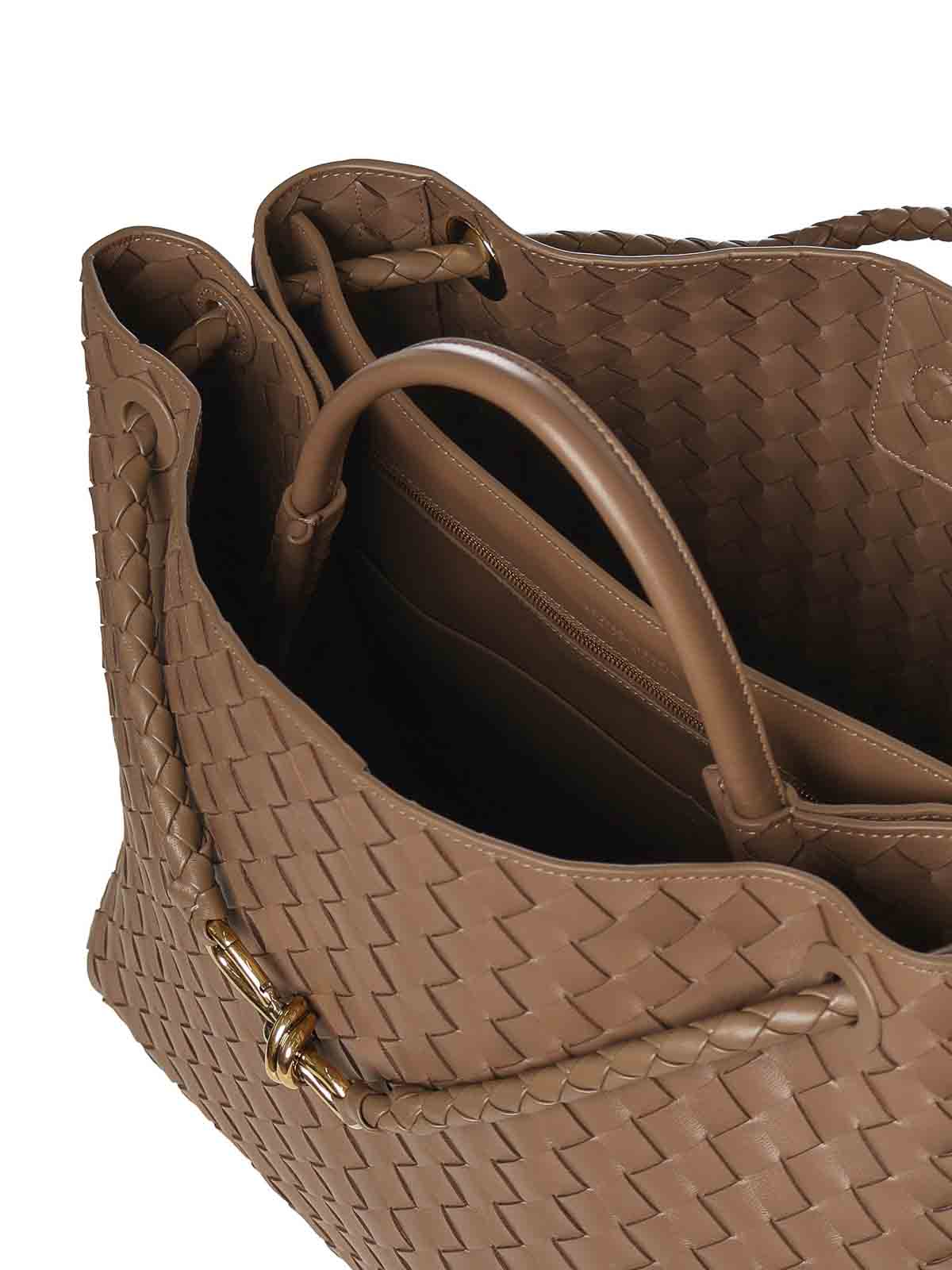 イントレチャート模様のラムスキン製、トップハンドル、スライド式ショルダーストラップ、マグネットクロージャー、寸法:42 x 35 x 18 cm、イタリア製、デザイナーカラー:パインコーン