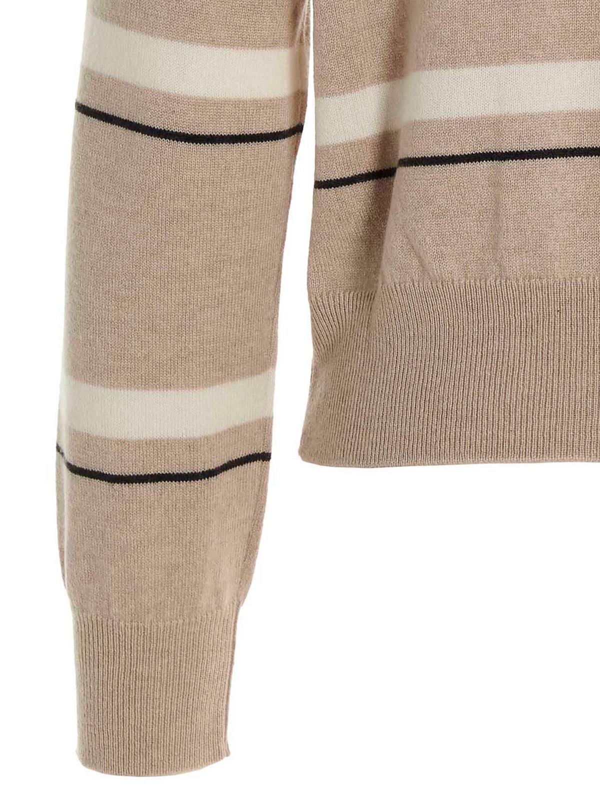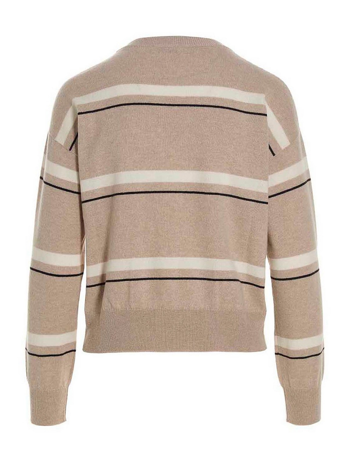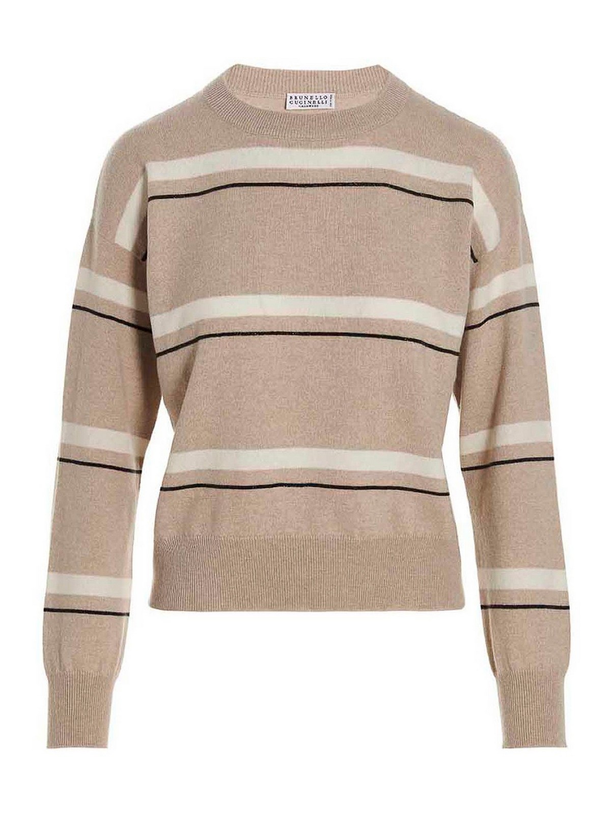 モニールのディテールをあしらったストライプのカシミヤセーター。クルーネック、ロングカフスリーブ。