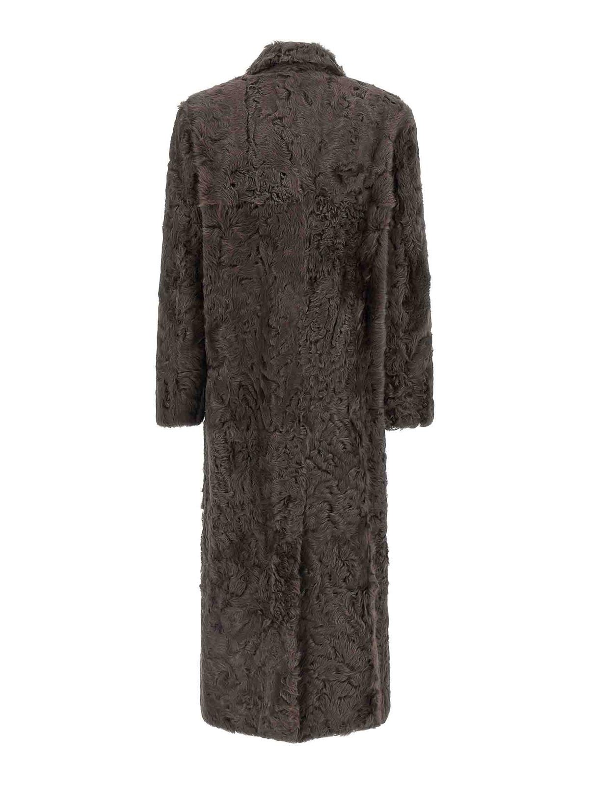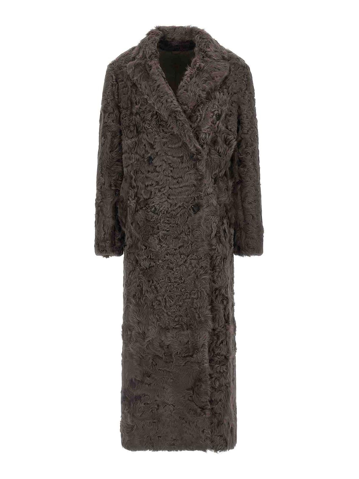 ウェーブのかかったロングコート。ダブルブレストのボタン付きラペルカラー。バックポケットにモニール、ロングスリーブ、バックスプリット、クレープ混紡生地。