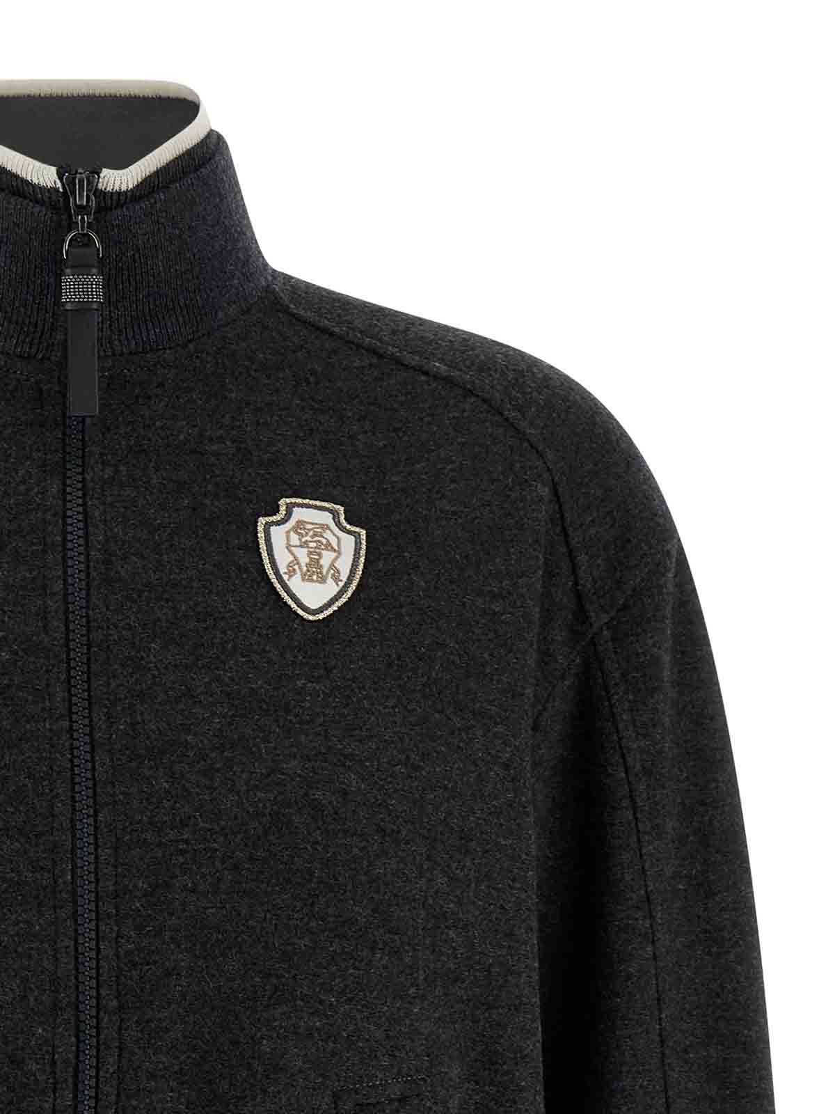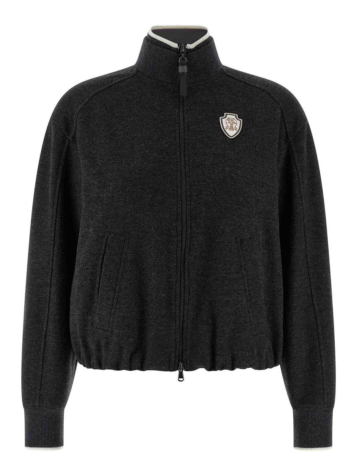 リブ編みのストレッチニットのインサートとコントラストの効いたディテール、ソロメオの紋章をあしらったパッチ、モニール「シャイニージッパープル」をあしらったフロントジッパー、ポケット、ロングカフスリーブ、伸縮性のある裾が特徴のカシミアマランジスウェットシャツ。