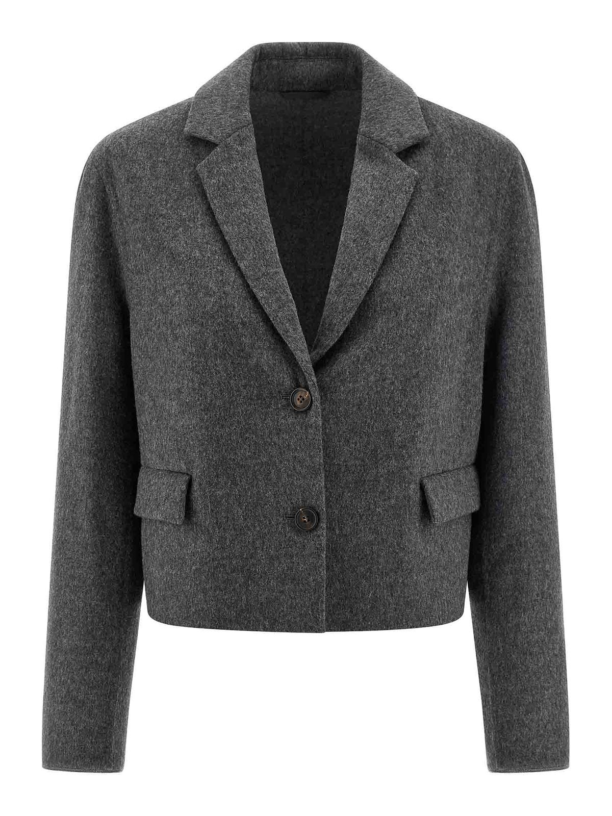 バージンウール生地を使用したダブルニット「クロップ」シングルブレストブレザー。フロントホーンボタン留め、ミラーラペル、フラップポケット、ドロップショルダー付きのロングスリーブ、袖下部のモニール「シャイニーカフ」、裏地なし。