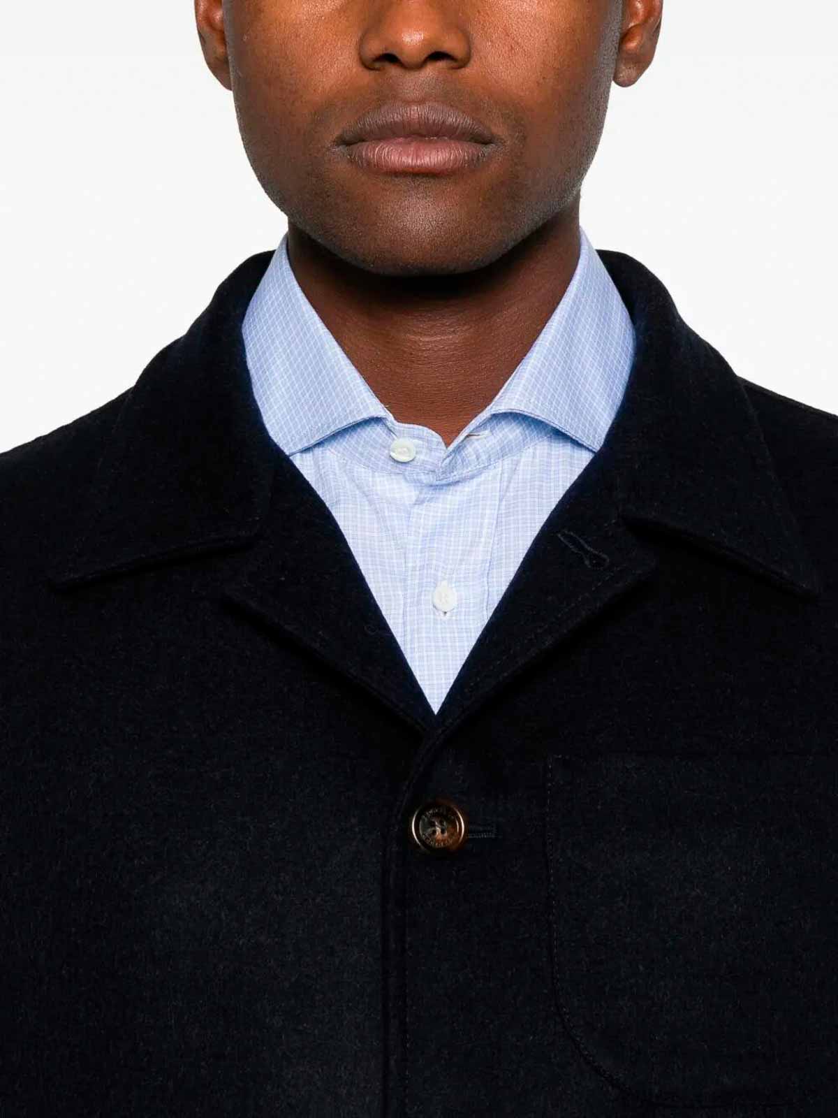 ネイビー、フロントボタン留め、胸パッチポケット、サイドスリットポケット、長袖、リブ編みの袖口と裾