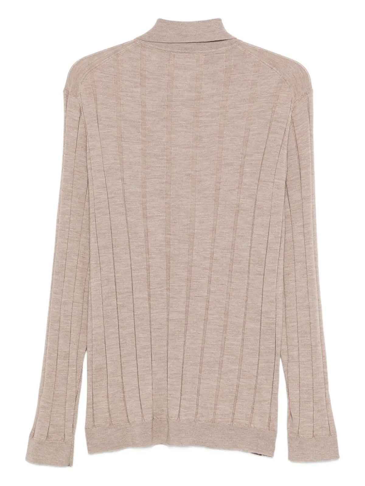リブ編みウールセーター、フロントボタン留め、ポロカラー、ロングスリーブ、ストレートヘム