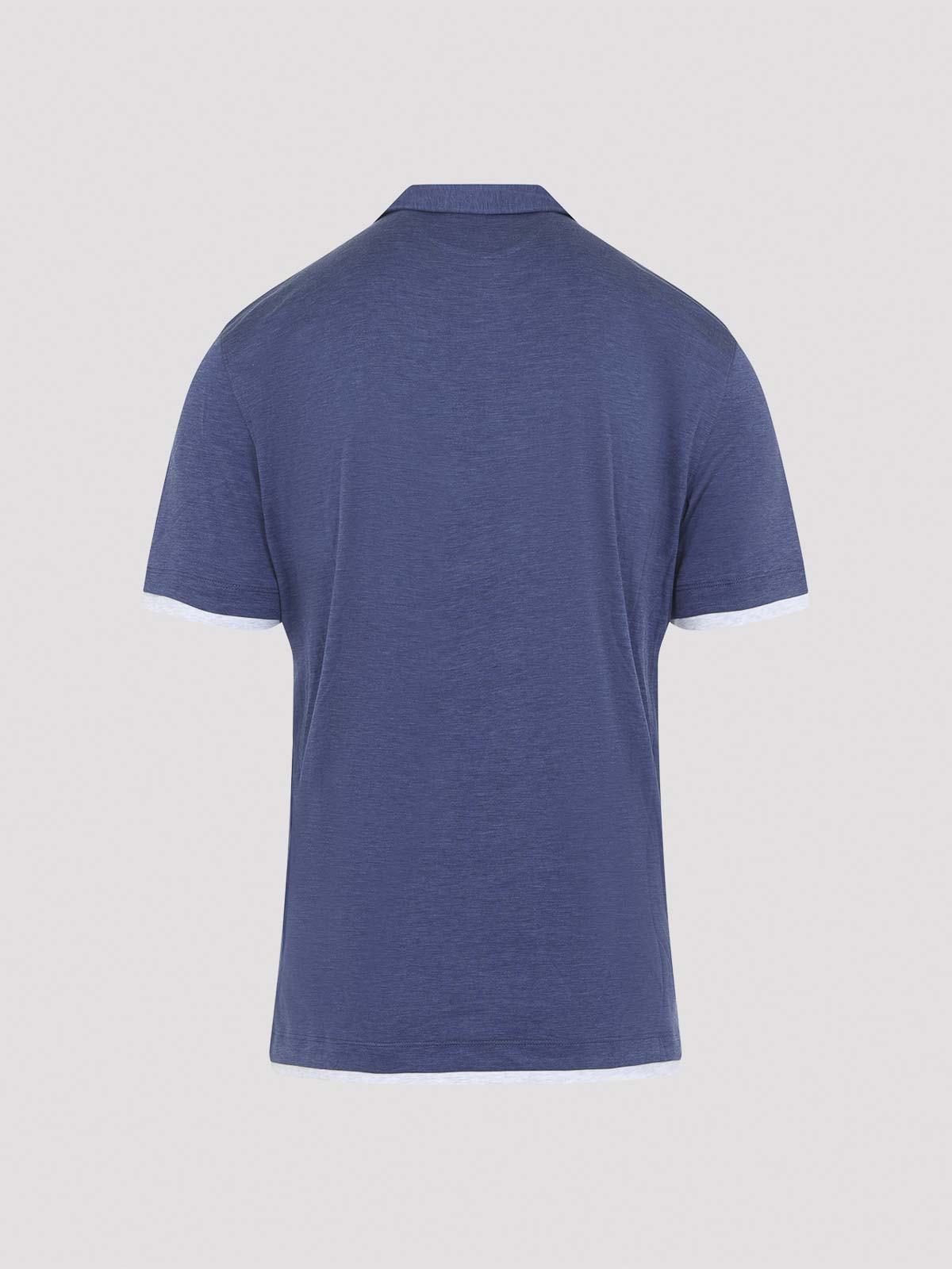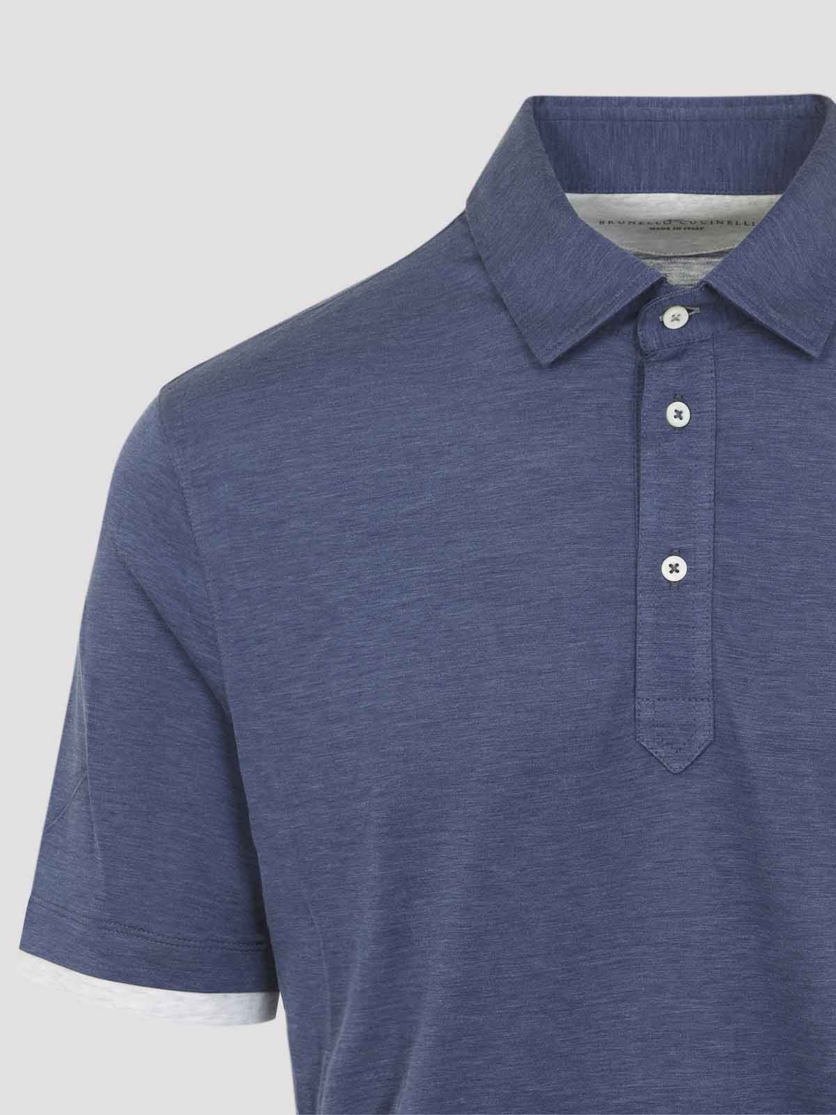 Brunello cucinelli ブルーのシルクポロシャツ。メランジブルーのシルクとコットンの混紡素材で作られており、クラシックなポロカラー、3つボタンの留め具、ショートスリーブ、袖口と裾のフェイクレイヤーが特徴です。