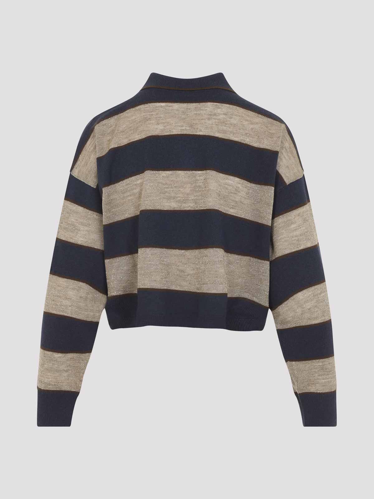 Brunello cucinelli ブルーウールジャージーストライプポロ。ウール、カシミア、シルクで作られています。クラシックなポロカラー、ドロップショルダー、ロングスリーブ、リブ編みの袖口と裾、クロップドデザイン、ストレートヘム。