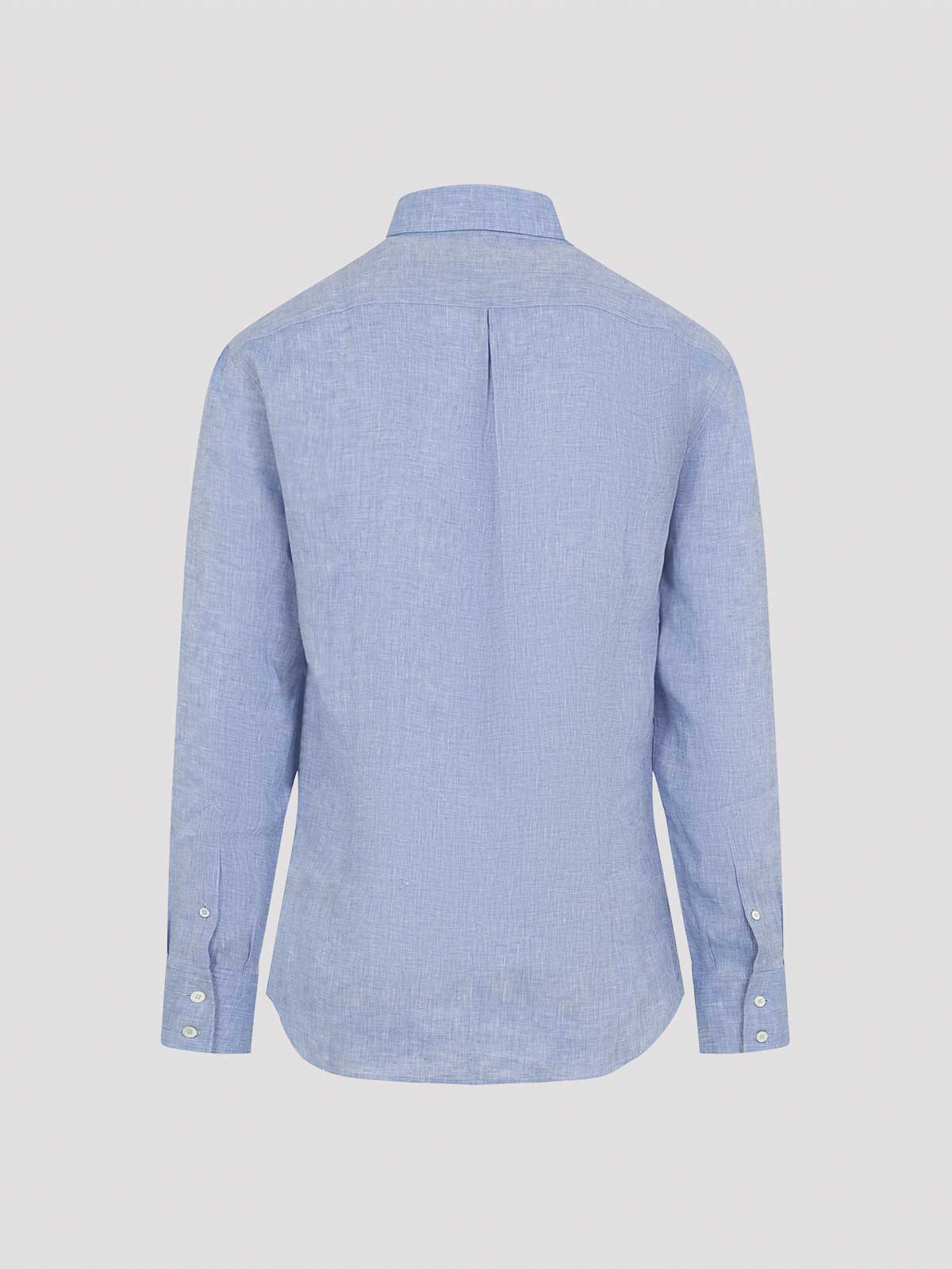 Brunello cucinelli ライトブルーのリネンシャツ。mlange ライトブルーリネン、ボタンダウンカラー、フロントボタン留め、ロングスリーブ、ボタン付きカフス、バックヨークとダーツ、ラウンドヘム。