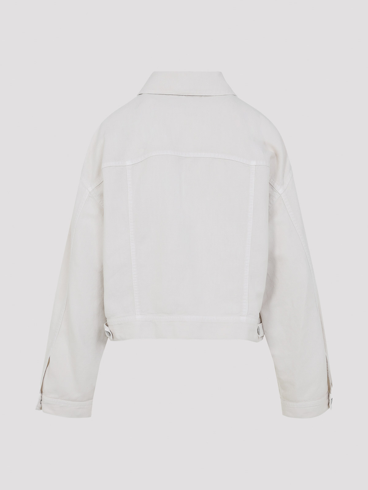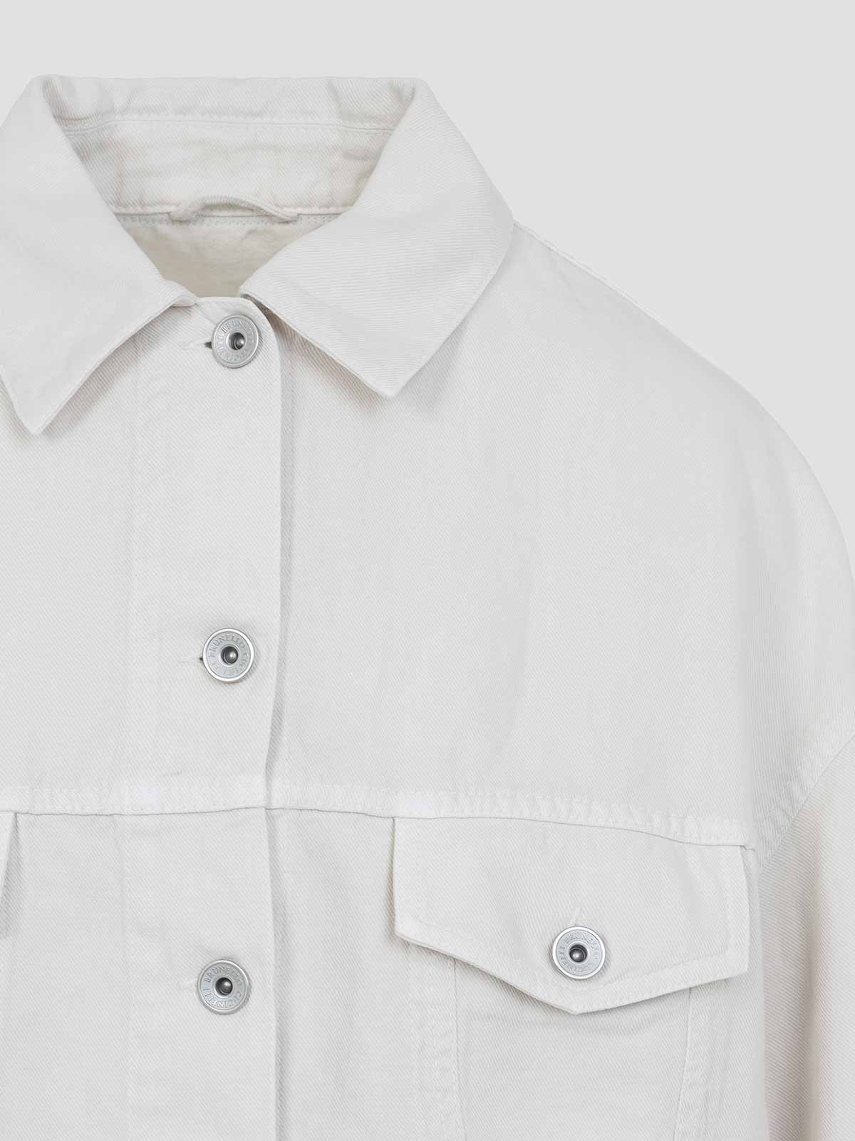 Brunello cucinelli チョークホワイトコットンクロップドブルジャケット。コットンとリネン製。ポインテッドカラー、フロントボタン留め、チェストフラップ付きポケット、ドロップショルダー、ロングスリーブ、ボタン付きカフス、ストレートヘム、クロップドデザイン。