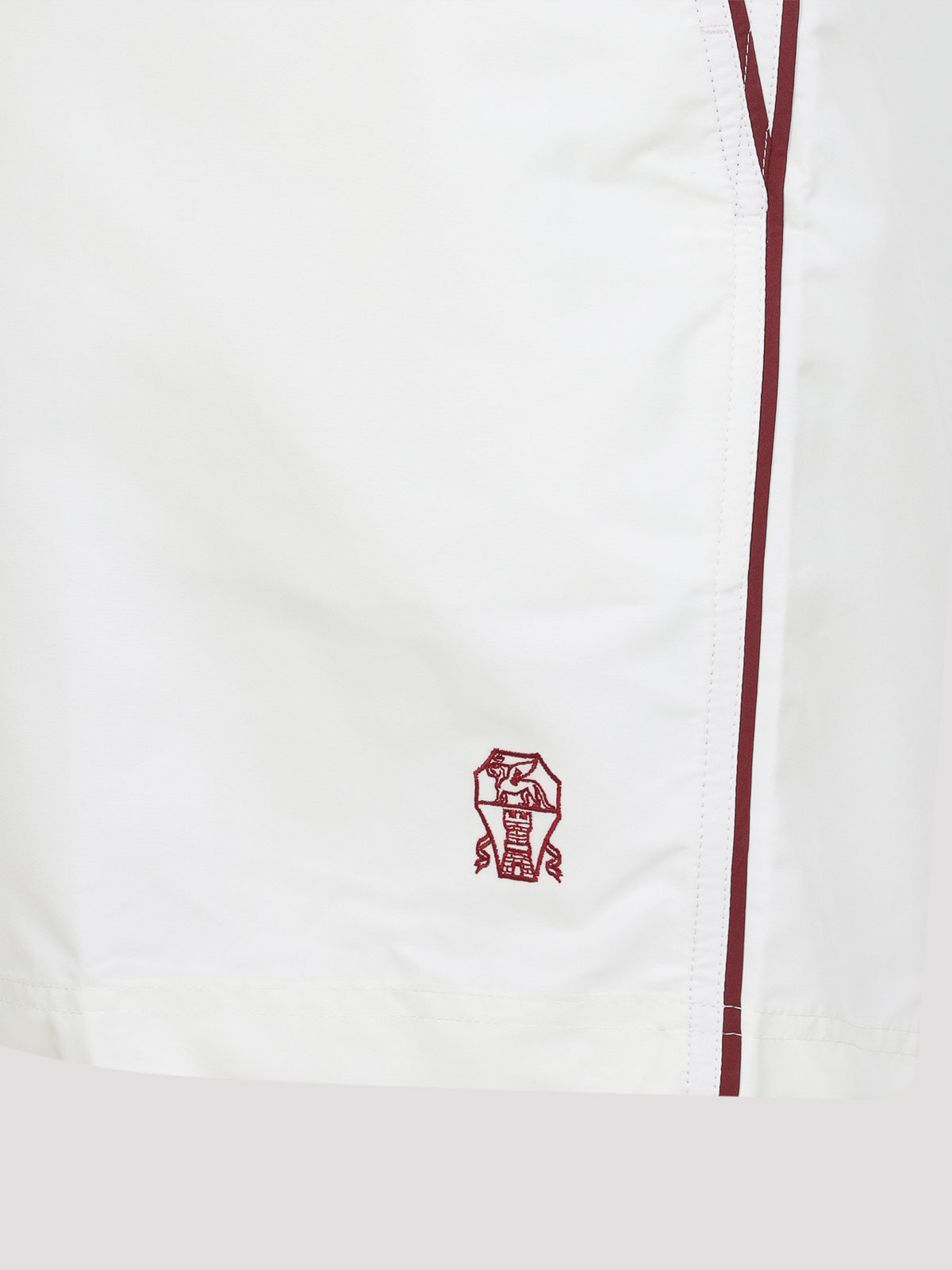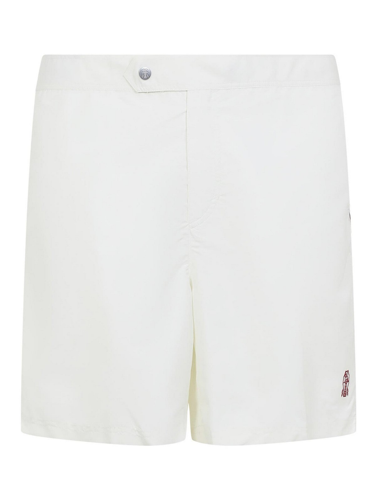 Brunello cucinelli ホワイトロゴ刺繍入りボタン付きスイムショーツ。ホワイトテック生地、レギュラーウエスト、フロントボタン留め、コントラストレッドトリム。ウエストにサイドバックル留め、3ポケットスタイル。コントラストの効いた赤のロゴ刺繍。