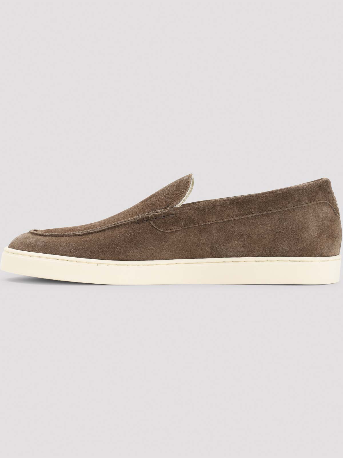 Brunello cucinelli ブラウンスエードレザーローファー。ピュアブラウンのスエードレザーローファー、ラウンドトゥ、スリッポンスタイル、ホワイトラバーソール。