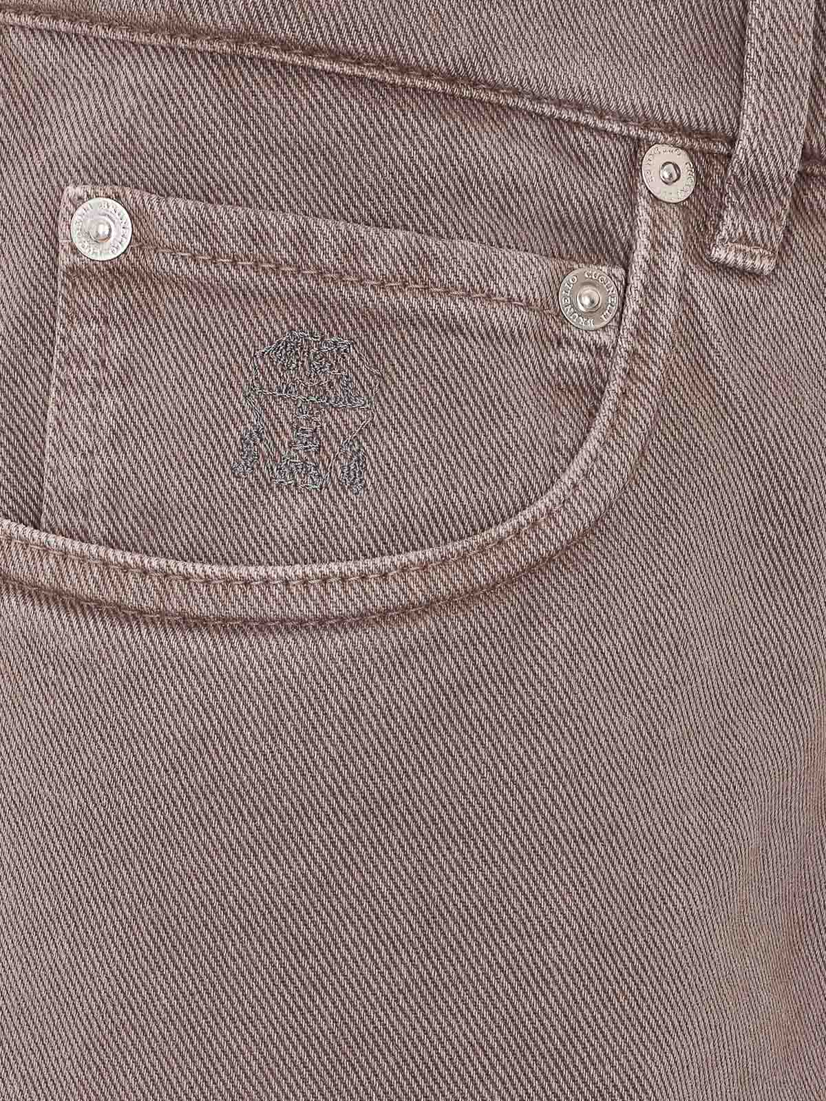 Brunello cucinelli ブラウンパンツ、ボタン留め、ポケット5つ、前面にロゴ刺繍、背面にパッチロゴ、レギュラーフィット