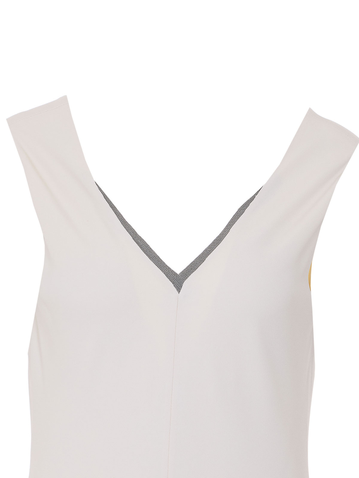 Brunello cucinelli チョークドレス、Vネック、モニールロゴ、ノースリーブ、ロングモデル、フレア&フルイドフィット、横ファスナー
