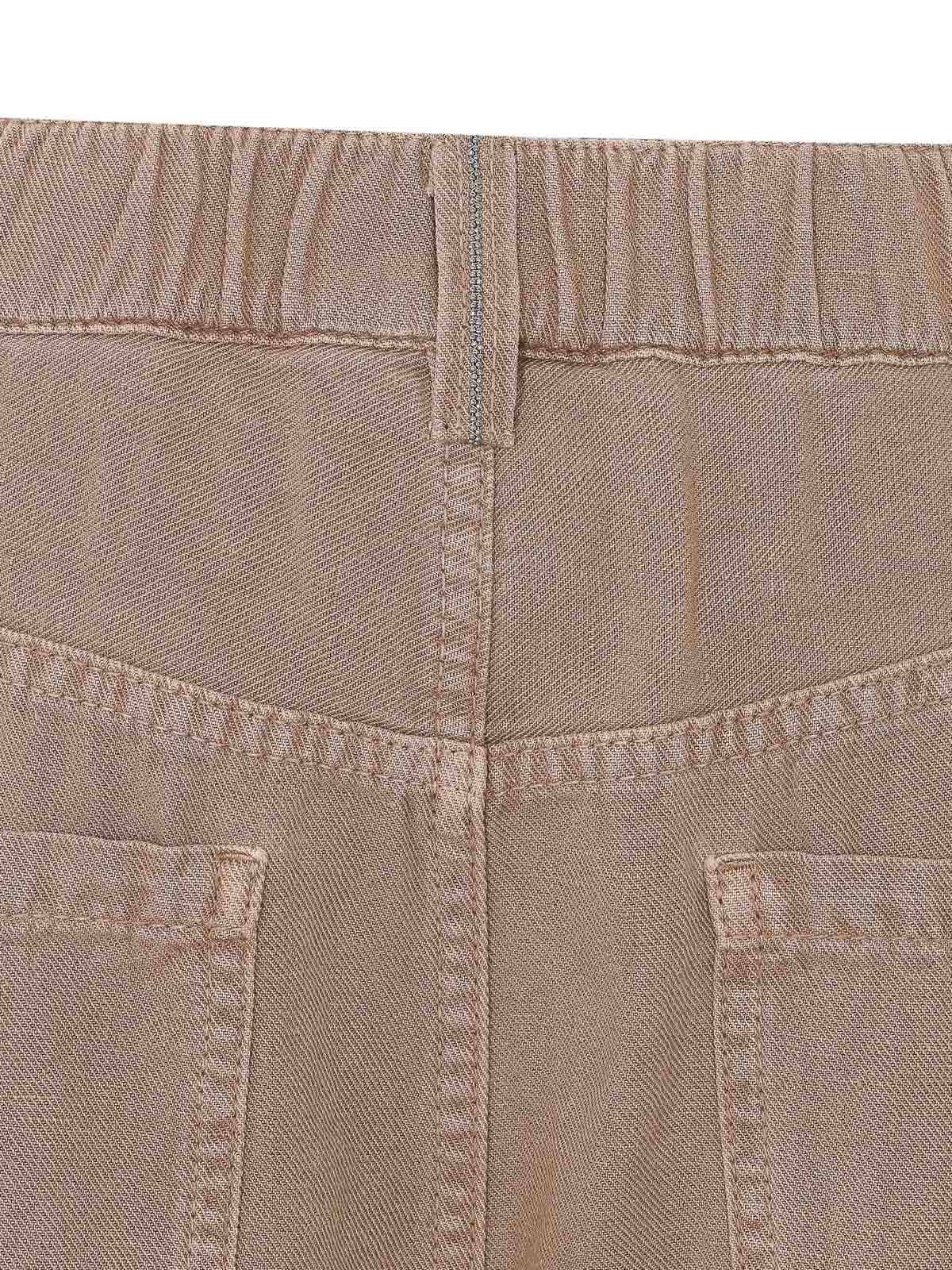 Brunello cucinelli ベージュパンツ、ウエストにゴム入り、ボタンとファスナー付き、ポケット5つ、背面にモニールロゴ