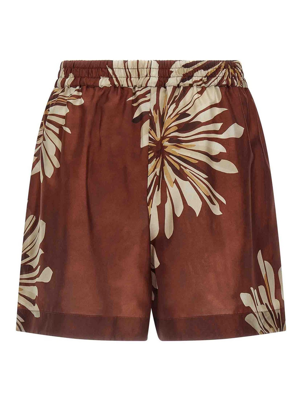 花柄のシルクショーツ、ワイドレッグ、伸縮性ウエストバンド、ポケット。