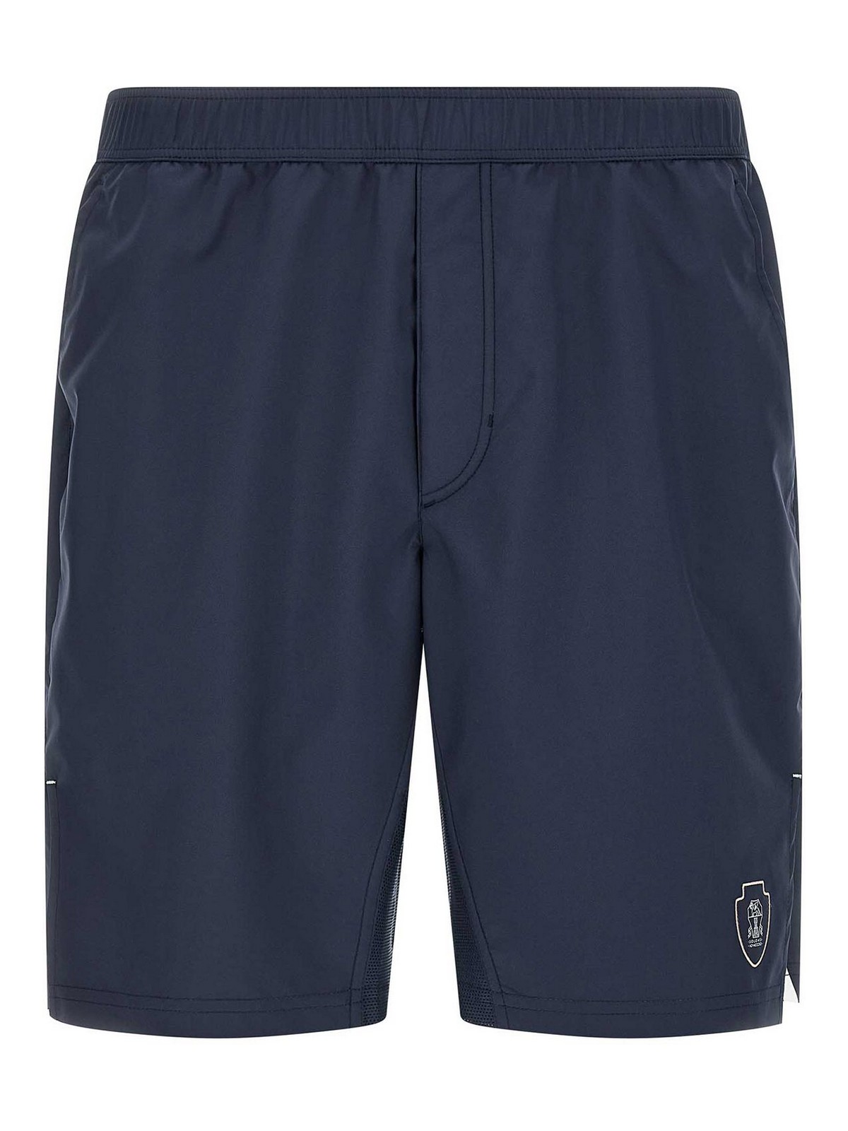コントラストの効いたディテール、刺繍、ロゴプリントをあしらったテニス用ナイロンバミューダショーツ、フロントにソロメオの紋章、ドローストリングの伸縮性ウエストバンド、Trompe l'Oeilフラップ、ポケット、メッシュインテリア、サイドスリット。