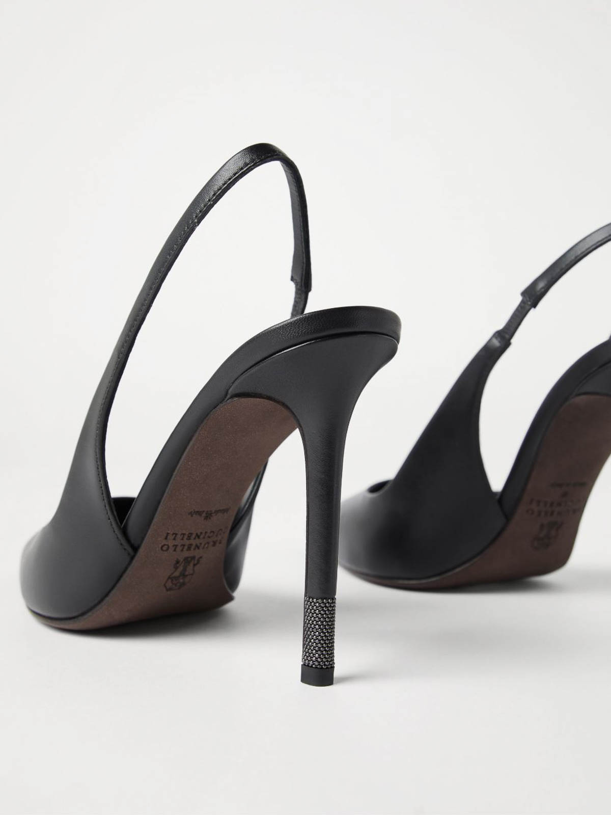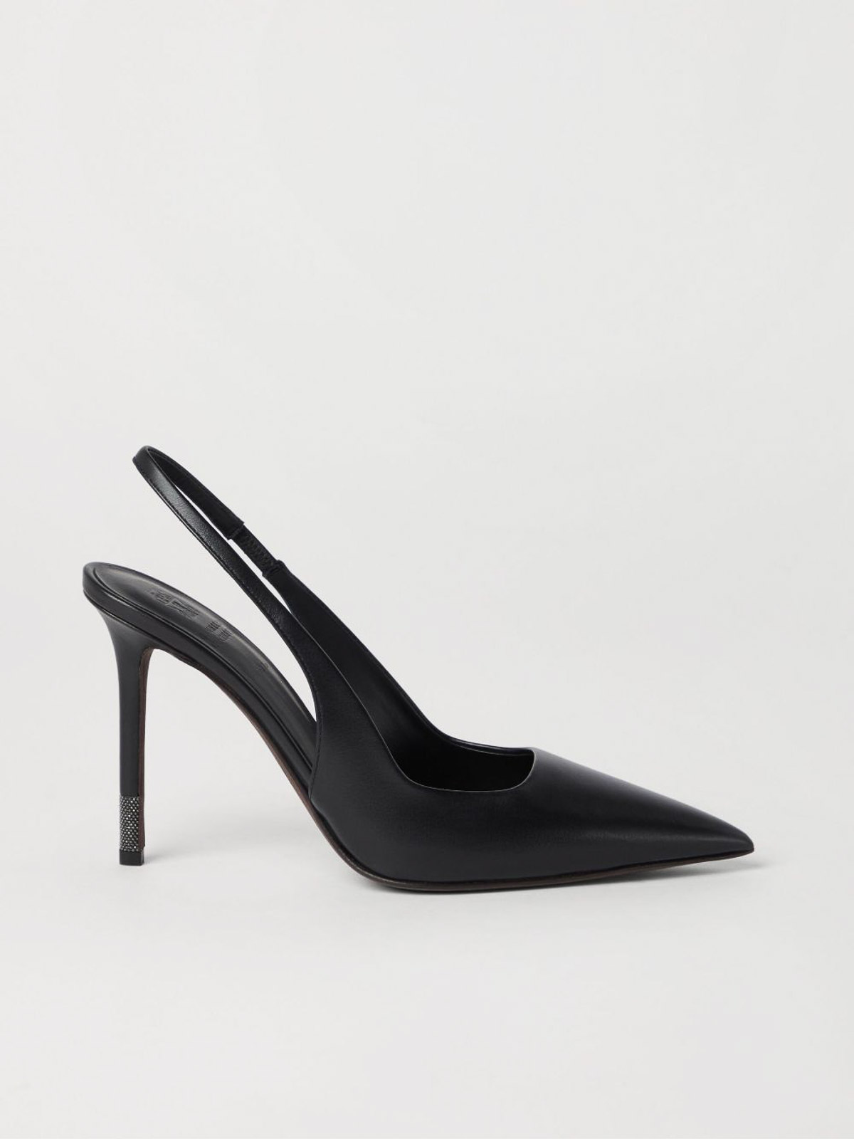 原産地:イタリア特徴ブラックカーフスキン特徴的なチェーンディテールヒールジュエリーヒールゴム入りヒールバンドスリップオンデザインポインテッドトゥハイスティレットヒールレザーインソール、ロゴ入りレザーソール。レザーソール。