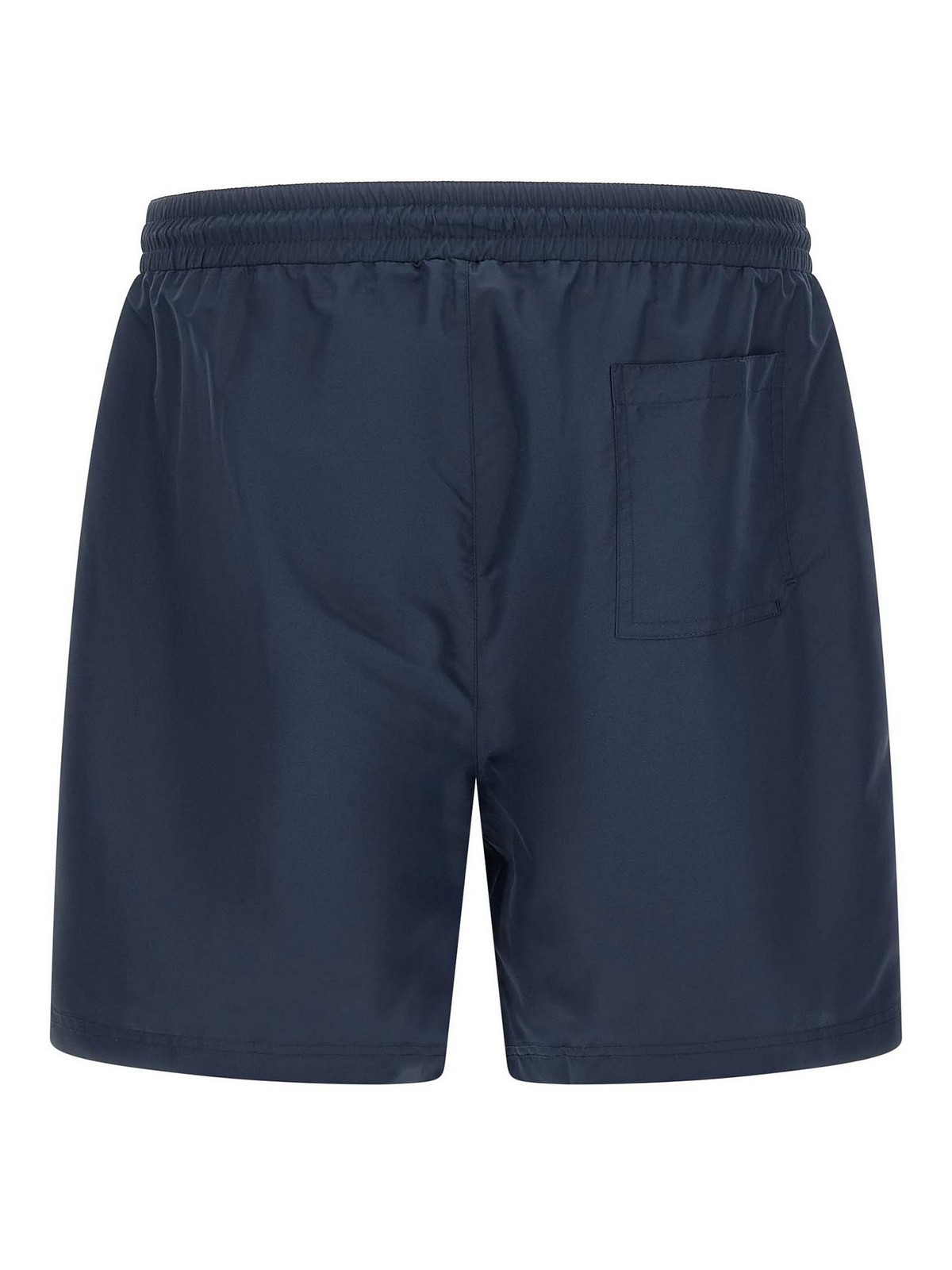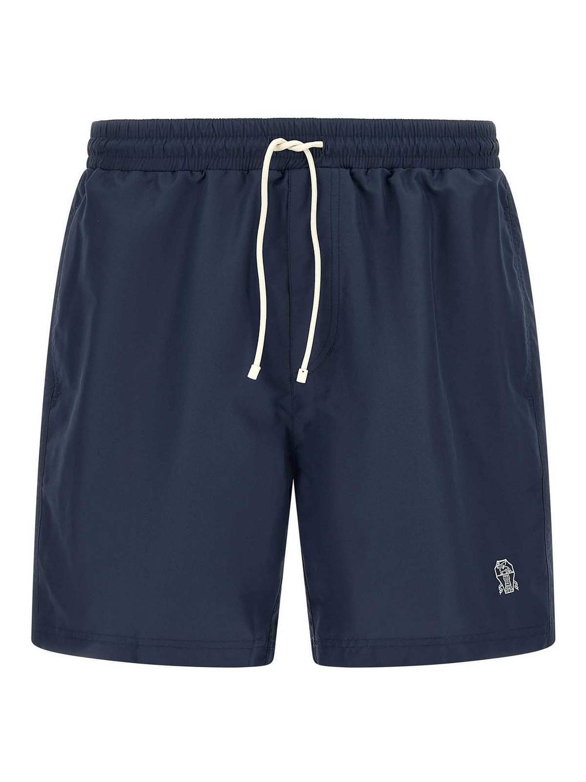 マットナイロンの水着、フロントにソロメオの紋章のロゴが刺繍され、ウエストにドローストリング付きゴム入り、トロンプルイユフラップ、ポケット、インナーメッシュブリーフ。