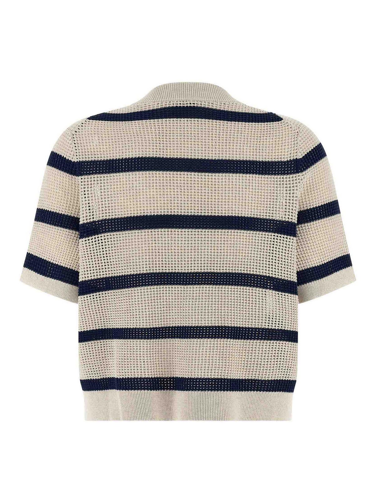 メッシュパターンのストライプコットンカーディガン、クルーネック、フロントボタンクロージャー、ポケット、袖口付き半袖、裾にバンド。