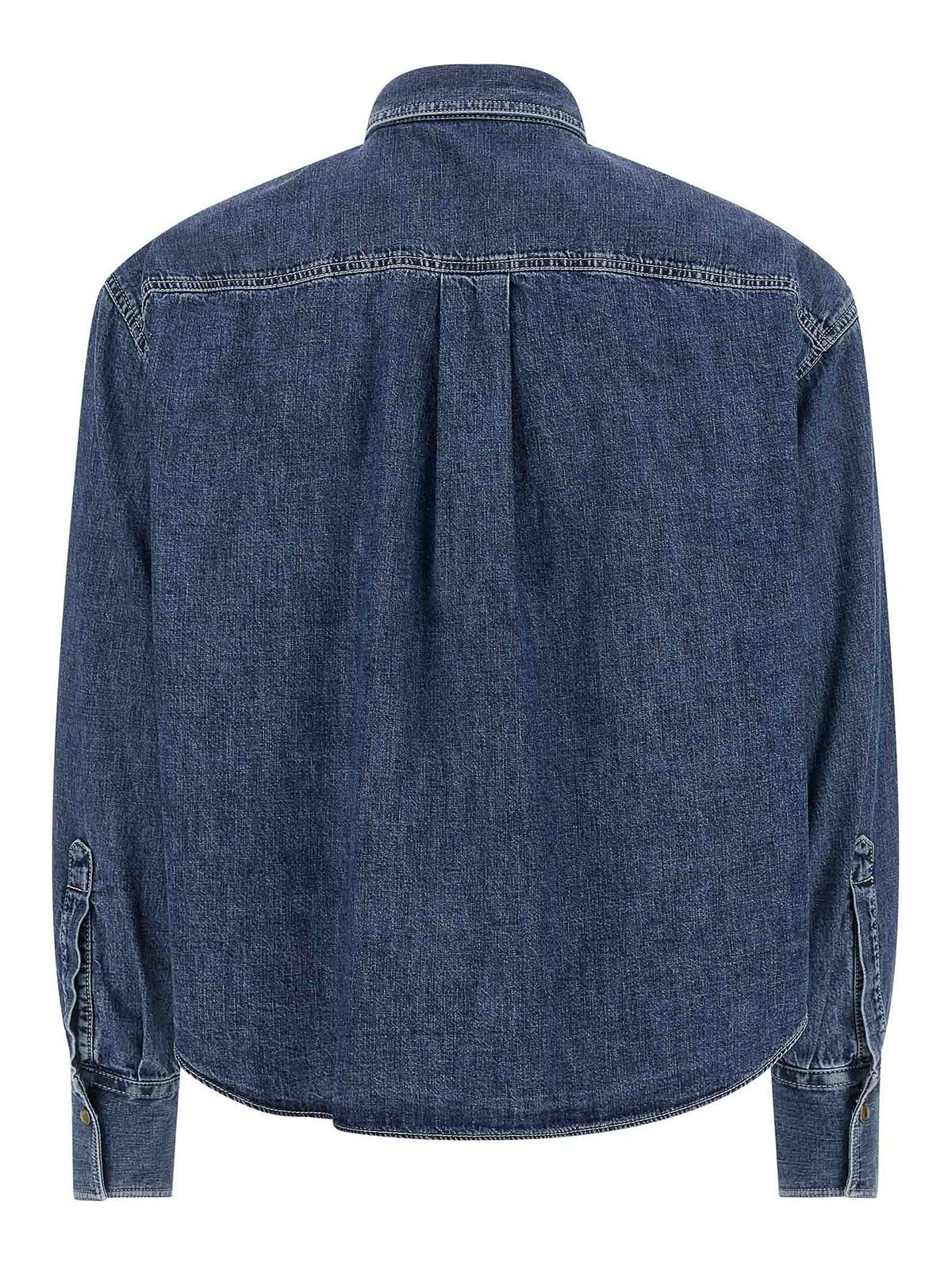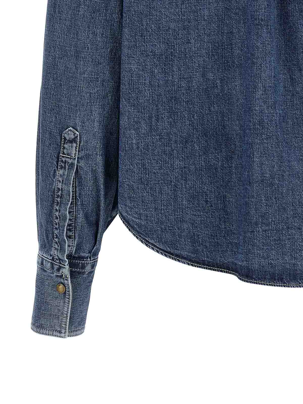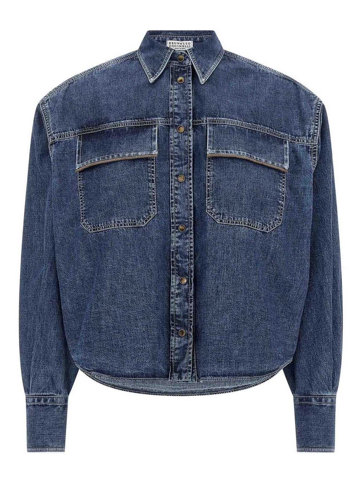 軽量デニムシャツ、コントラストステッチ、ややクロップドフィット、フラップにモニールのディテールをあしらった光沢のあるポケット、クラシックなポインテッドカラー、スナップボタン付きのフロントプラケットクロージャー、カフスとドロップショルダー付きのロングスリーブ、丸みを帯びたアシンメトリーなヘム。
