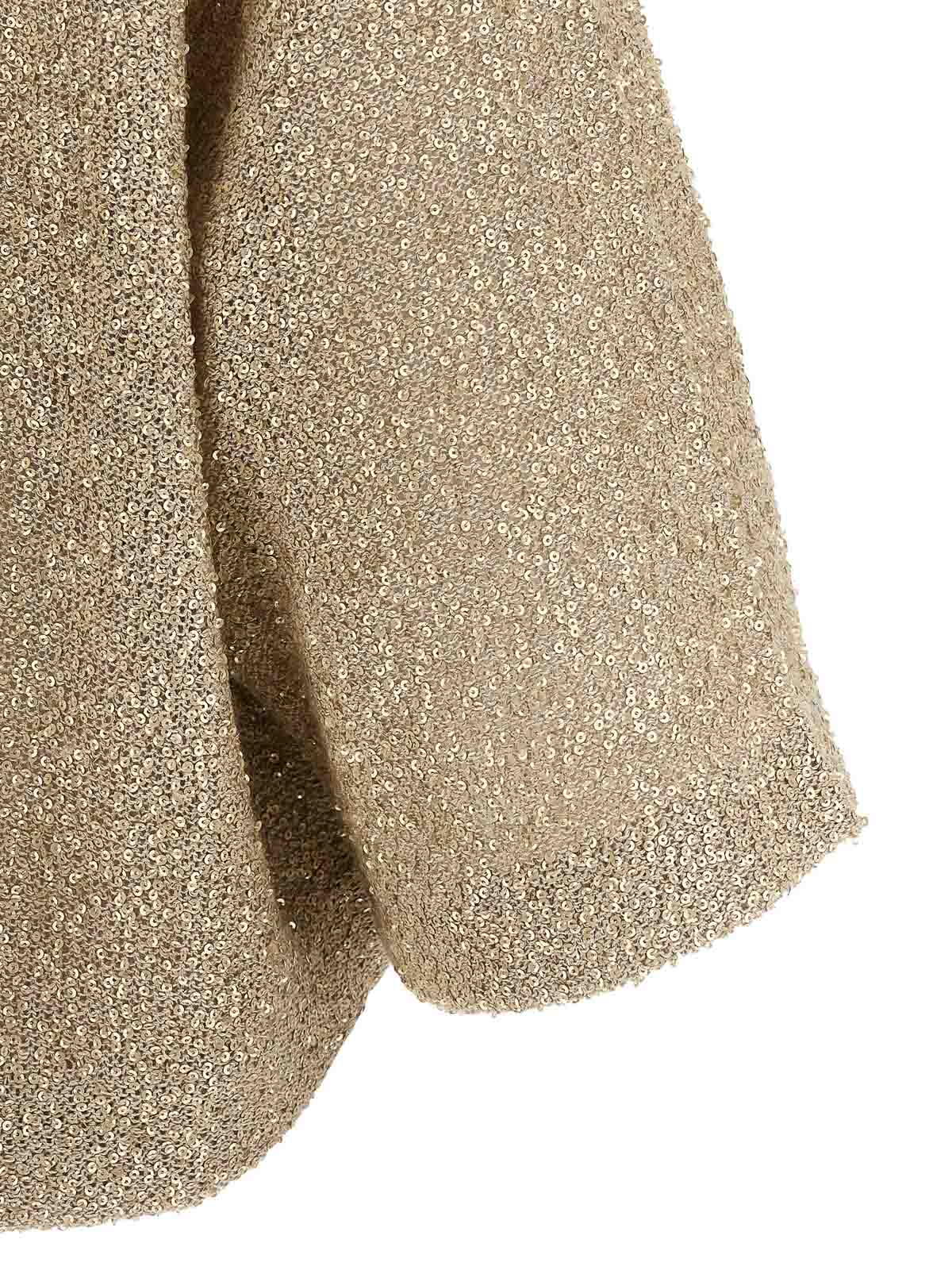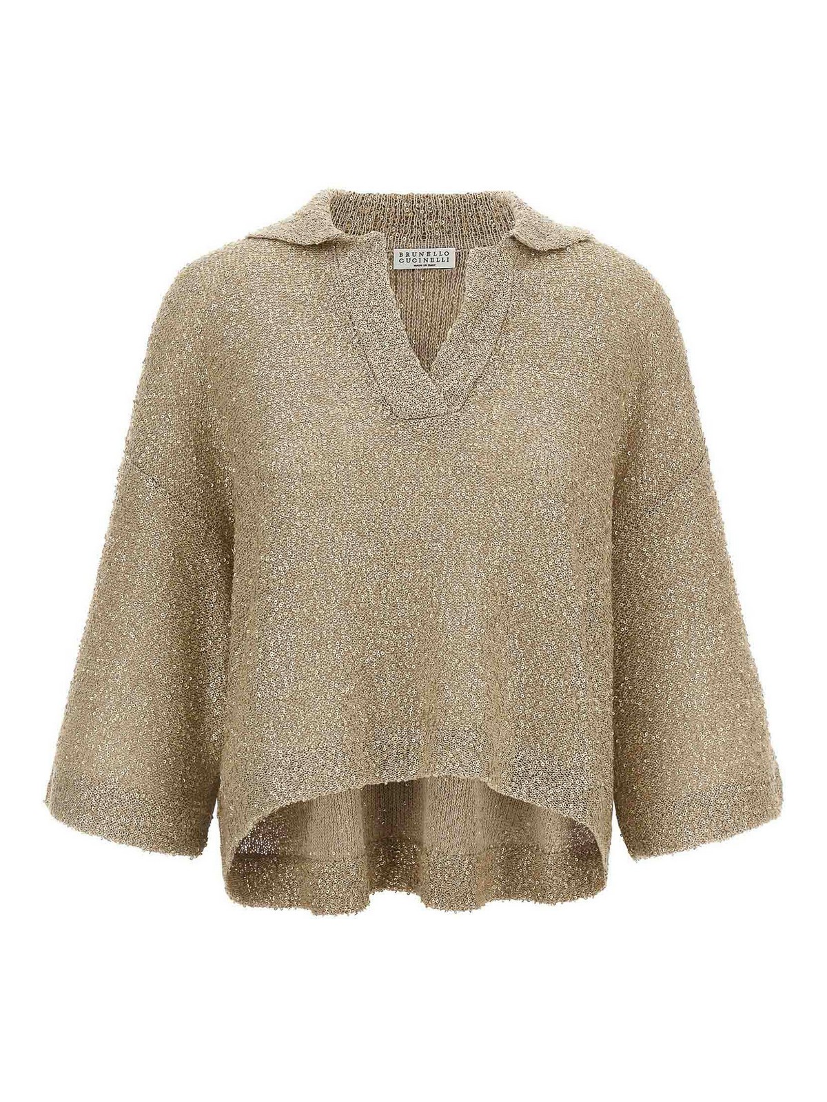全体にマイクロスパンコールをあしらったシアリングニットポロシャツ、Vネックと襟、ドロップショルダー、3/4ワイドスリーブ、アシンメトリー丈。