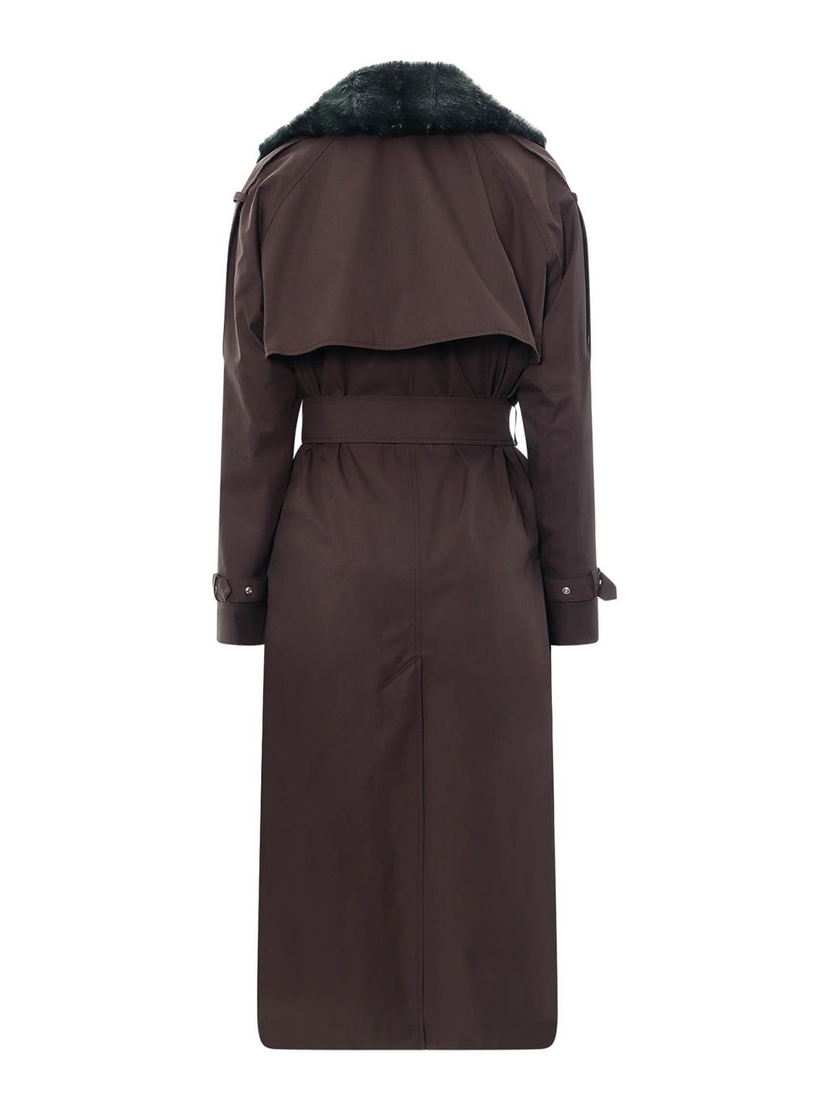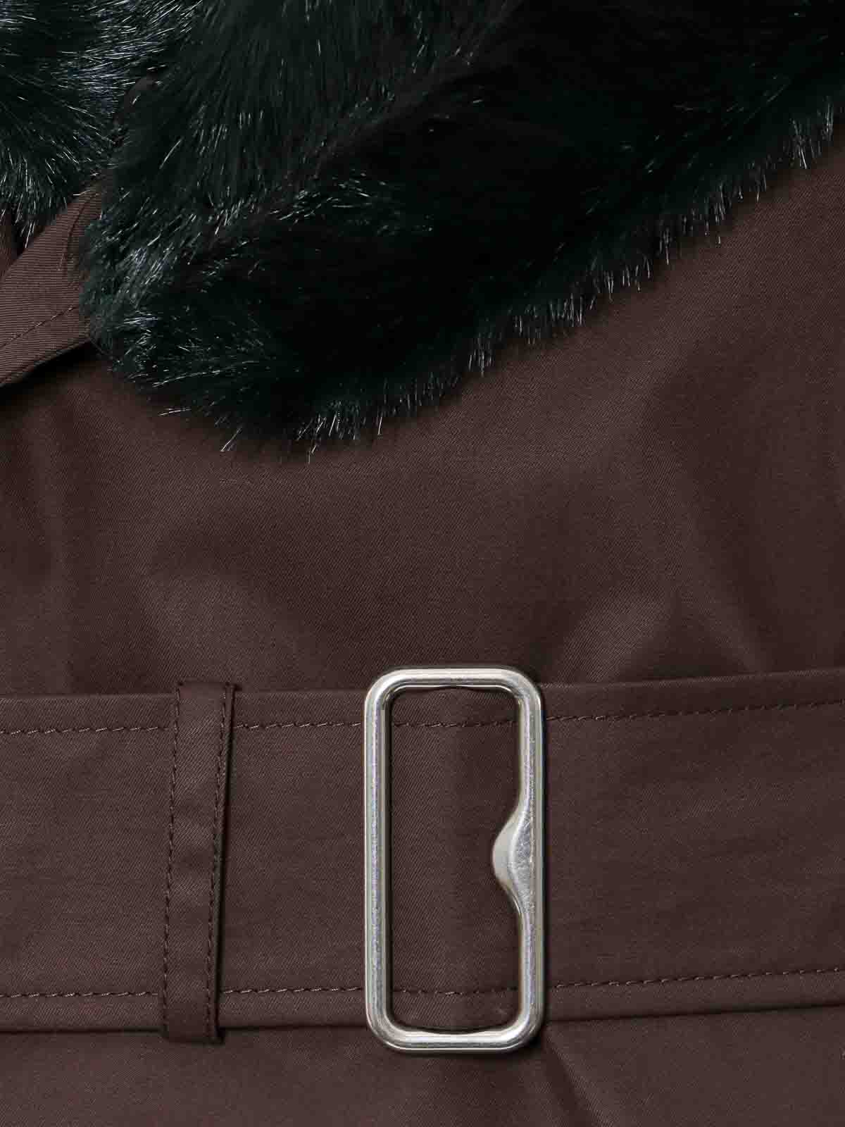 取り外し可能なフェイク素材のオーバーサイズトレンチ。ダブルブレストでウエストにボタンで調節可能なベルト、チェックモチーフのBバックルポケットが特徴です。