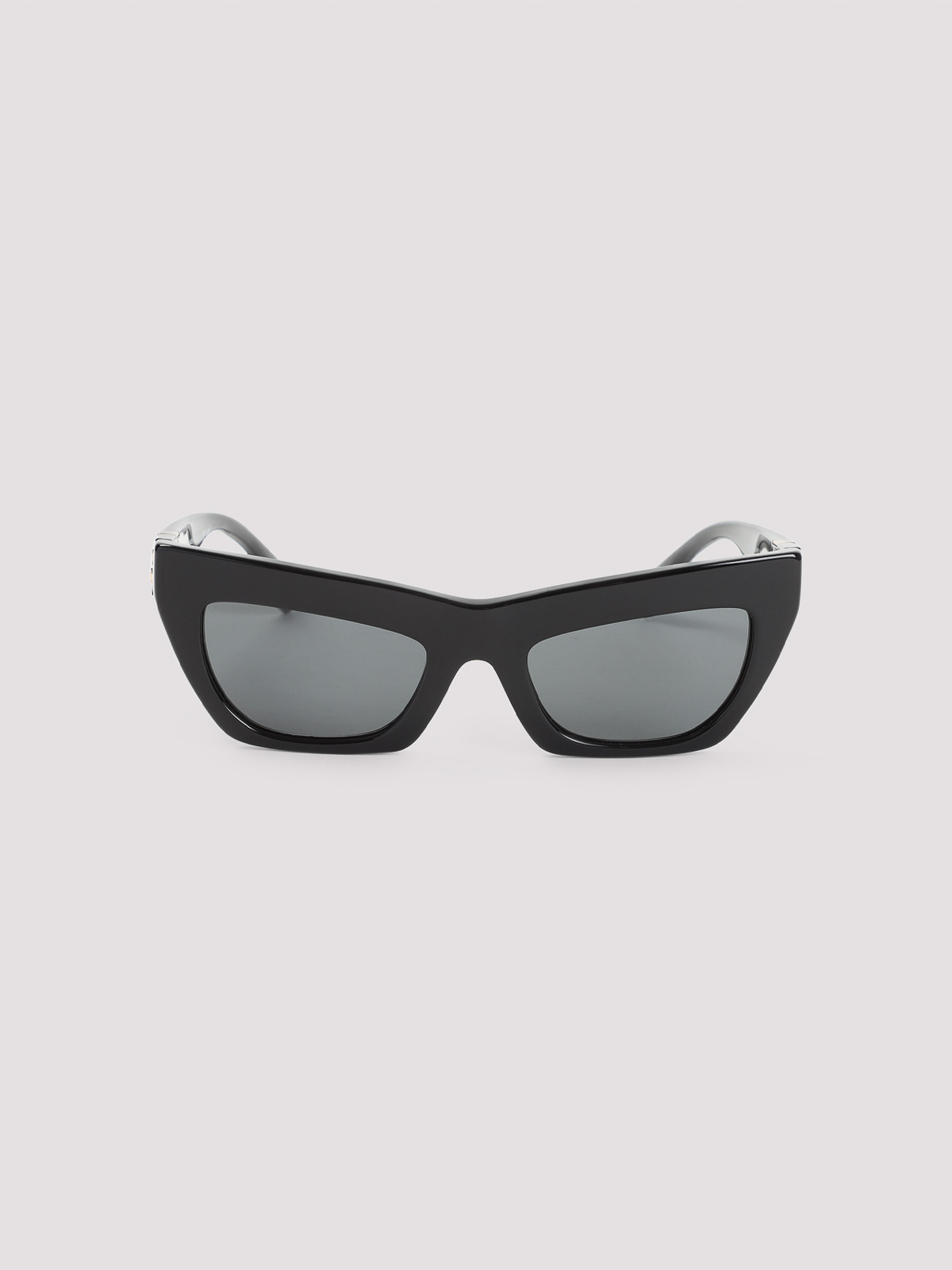 黒い四角い猫から作られたバーバリーのブラックサングラス、アイフレームは金色、テンプルの同系色のレンズにはトーンの入ったロゴ
