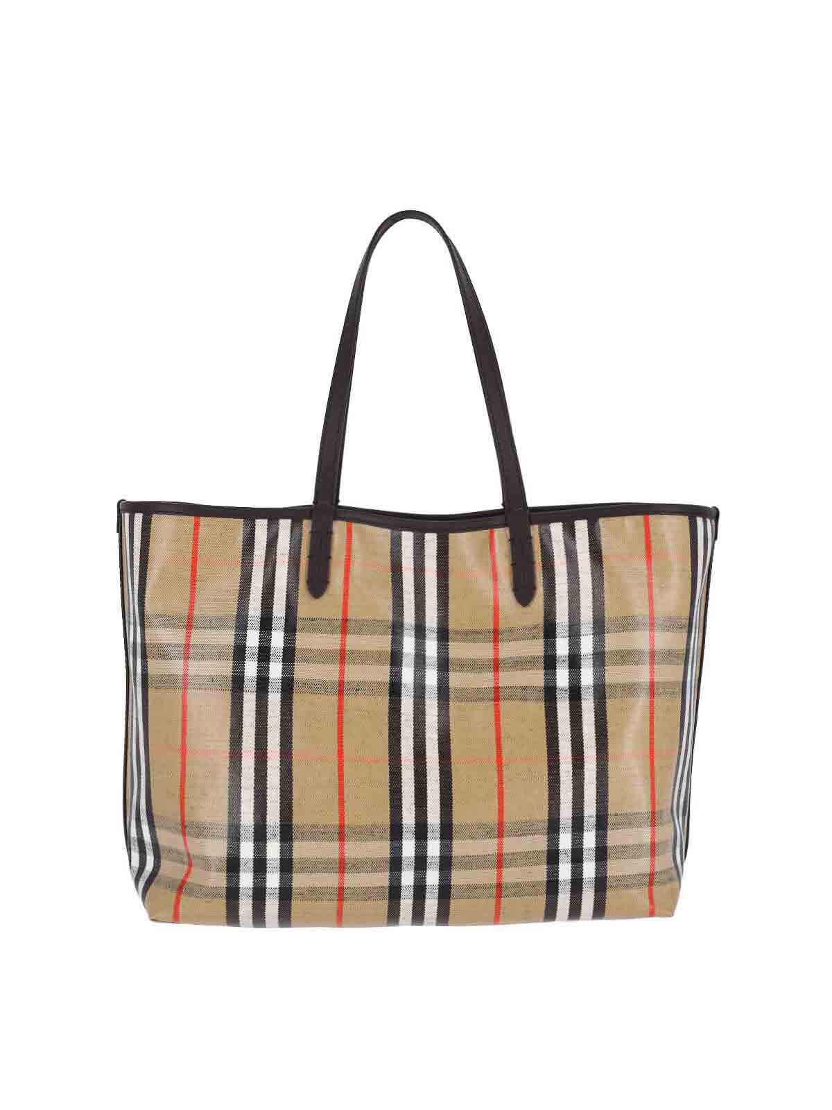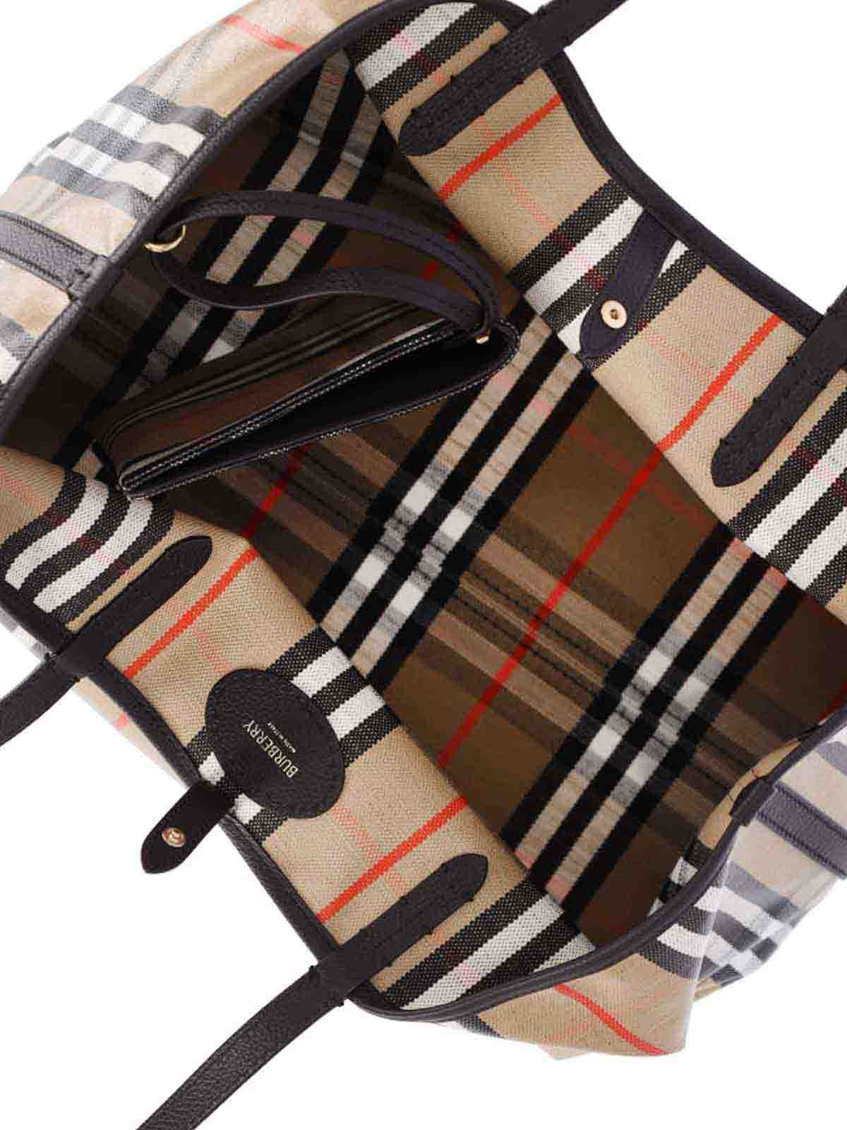 ハイランズメディアトートバッグ、バーバリー、ビスコースコットンとベージュリネン、ベールレザー仕上げ、チェック、ハンドル2つ、ハンドル2つ、プレッシャーボタンクロージャー、取り外し可能なインナーポーチ、プレッシャーボタンクロージャー、ユニークな内部コンパートメント。