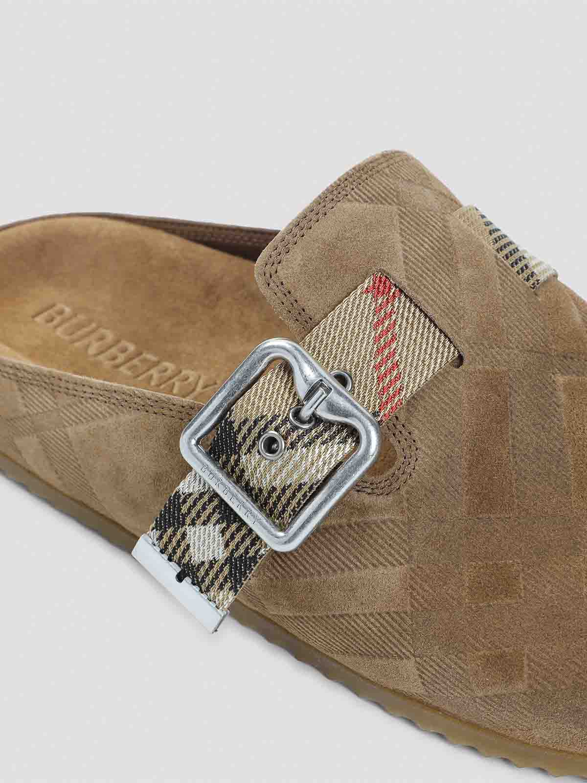バーバリーウニブラウンのスリッパは、全体にベージュのエンボス加工チェック柄をあしらった丸いつま先オープンバックチェックアジャスタブルストラップ付き、引き締まったバックル付き