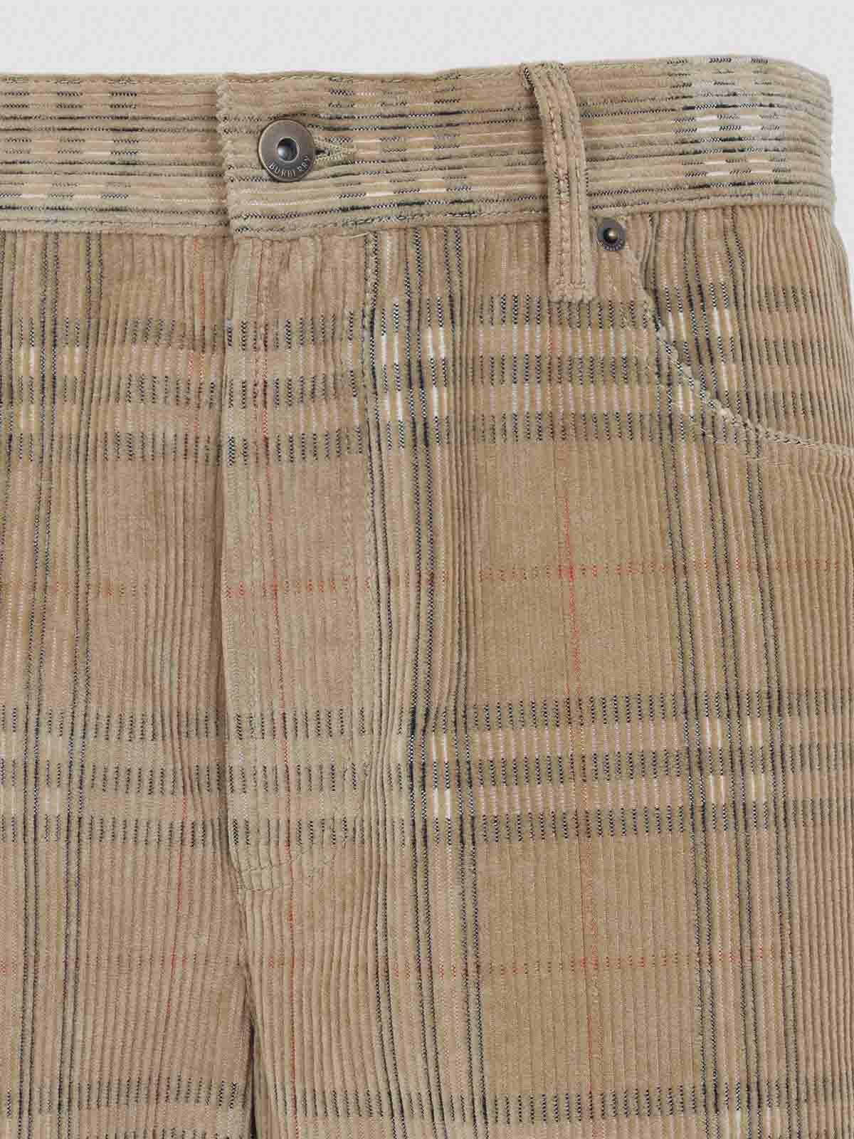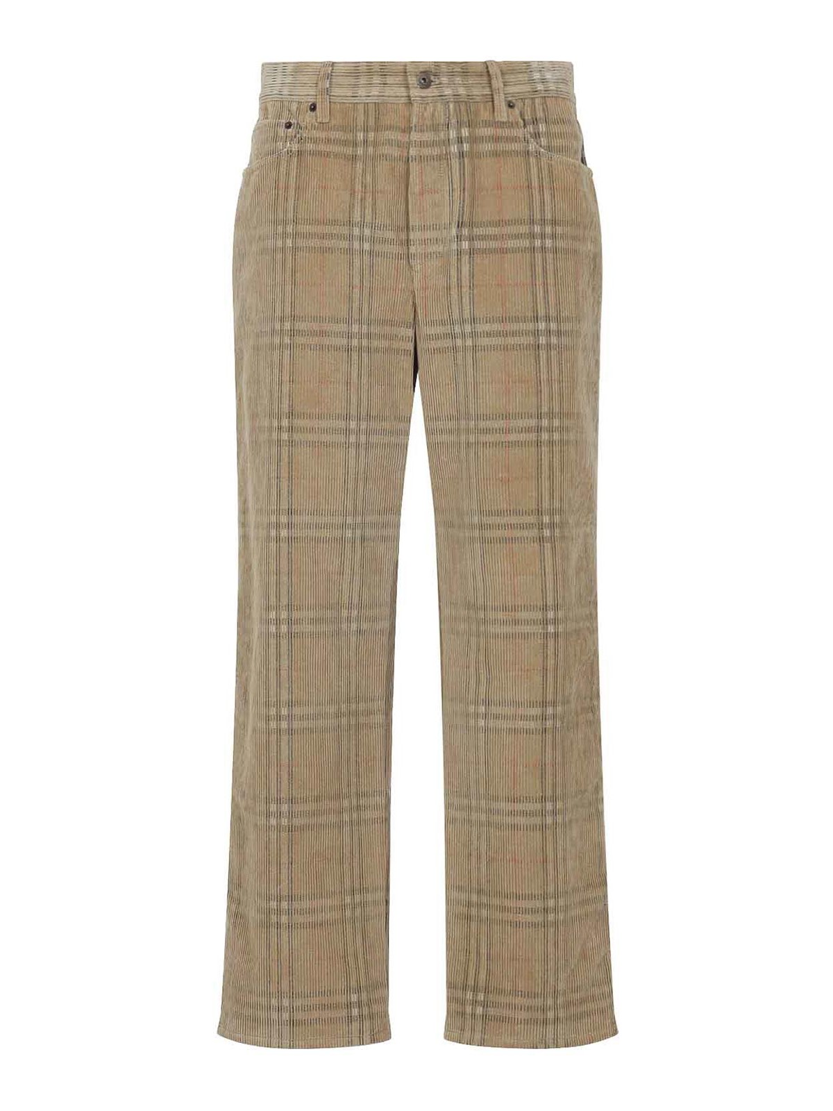 バーバリーフレッドチェックベージュコットンパンツ。ベージュのチェック柄コットンコーデュロイ製、ミッドライズウエスト、ベルトループ、5ポケット構造、フロントボタン留め、バックウエストバンドにレザーロゴパッチ、レギュラーフィット。