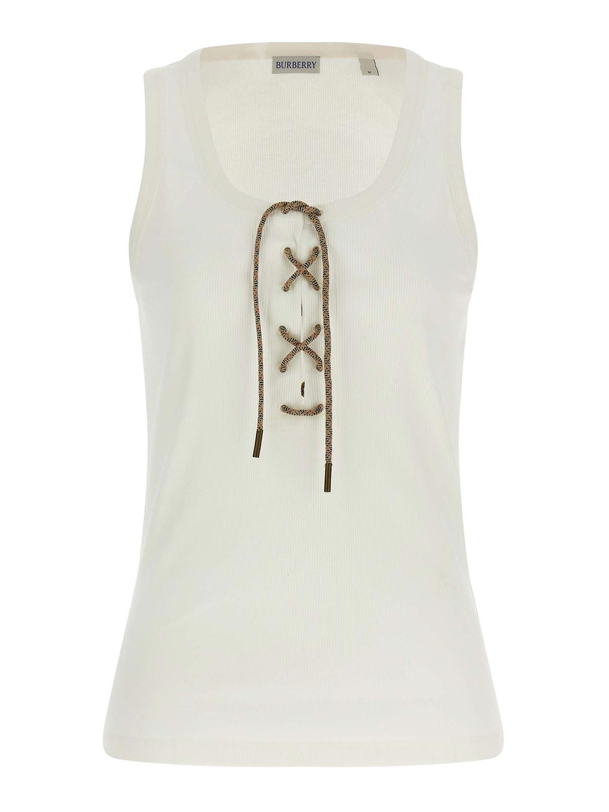 Cleoのリブ編みのストレッチコットンタンクトップ。前面にはトーン・オン・トーンの「馬術騎士デザイン」の刺繍が施され、幅広のラウンドネックラインにはバーバリーチェックのレース留めが付いています。