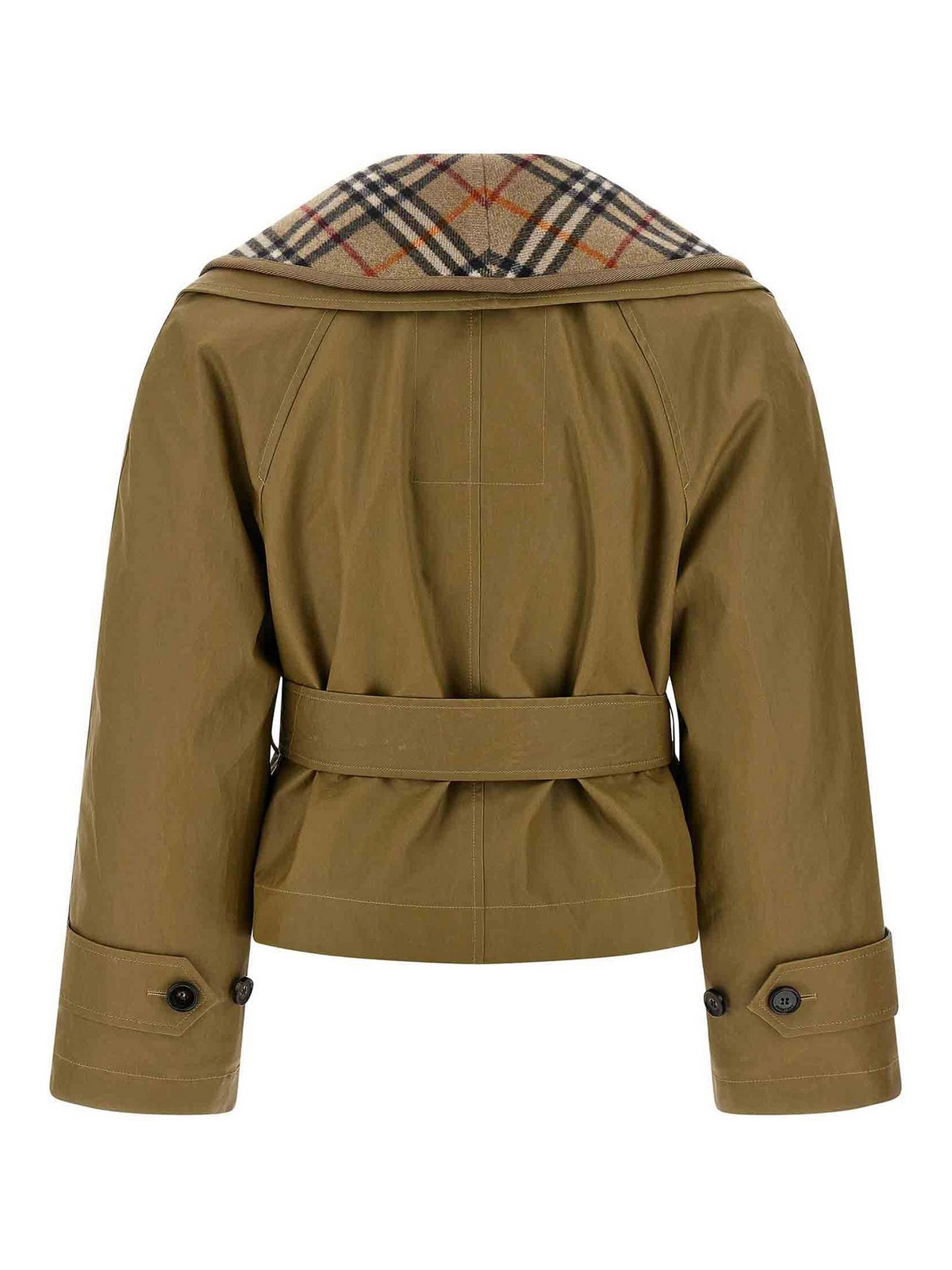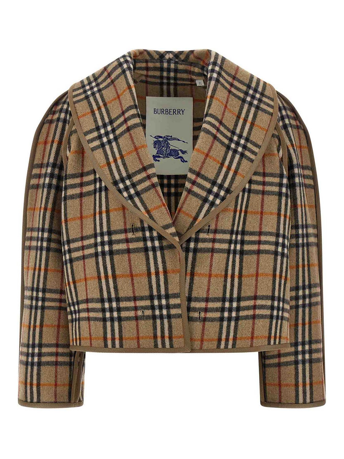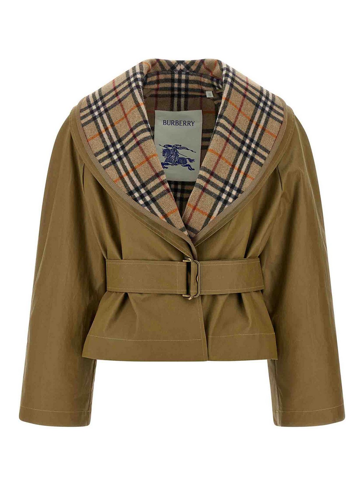 バーバリーチェックワックスコットン「カールトン」ジャケット。フロントにコントラストの効いたショール効果を生み出す取り外し可能なウールキルティング付き。クロップスタイル、ショールカラー、フロントボタンクロージャー、ポケット、長袖、取り外し可能なB字型メタルバックル付きベルト。