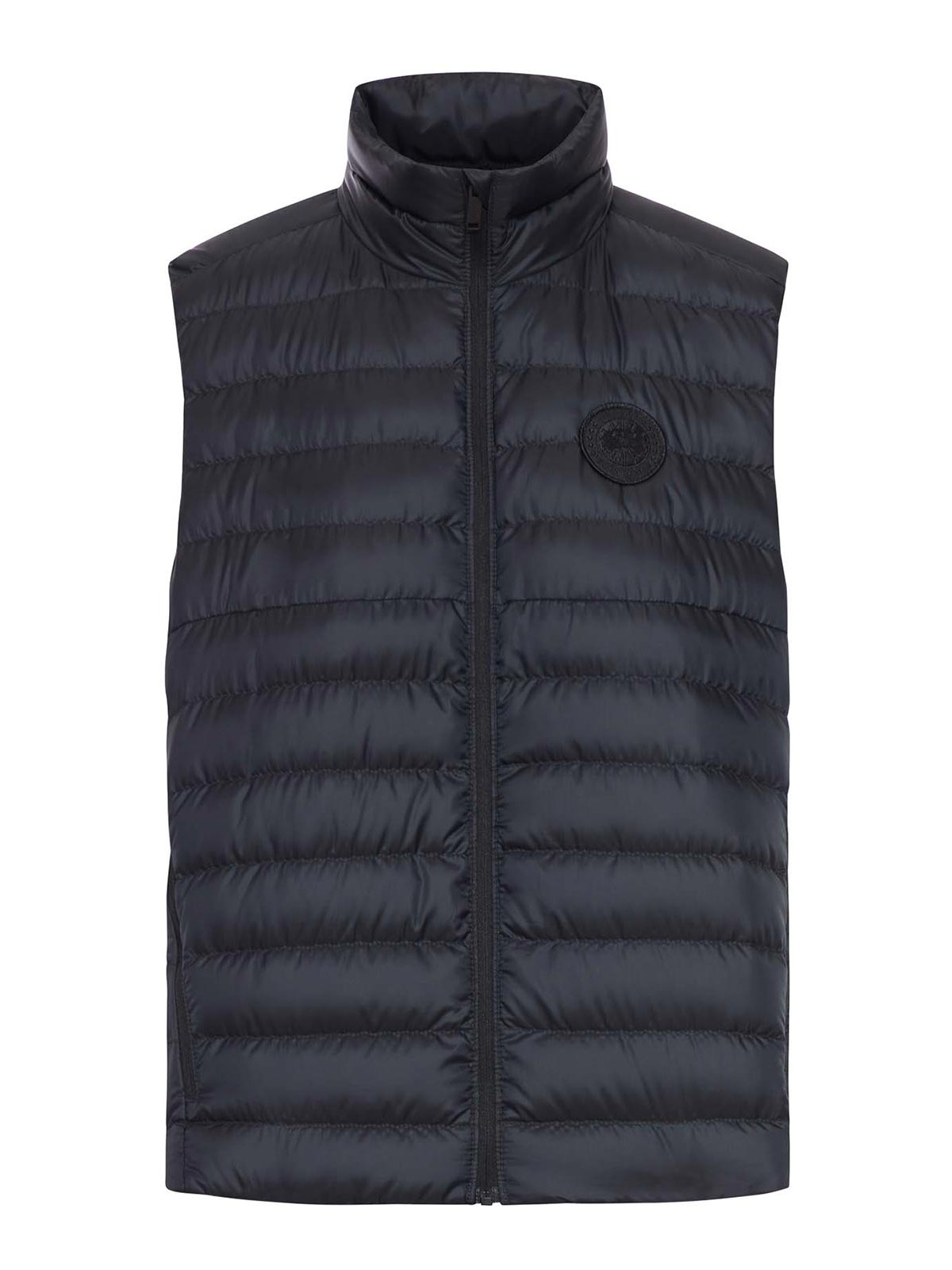 ハイネック、ノースリーブ、ワンウェイジッパー、胸に刺繍入りロゴパッチ、右側のポケットに折りたたむと、キャリーストラップ付きのパッカブルバッグ、ジッパー付きハンドポケット2つ、内側にドロップインポケット1つ、ジッパー付きセキュリティポケット1つ、ドローストリングヘム、色:黒