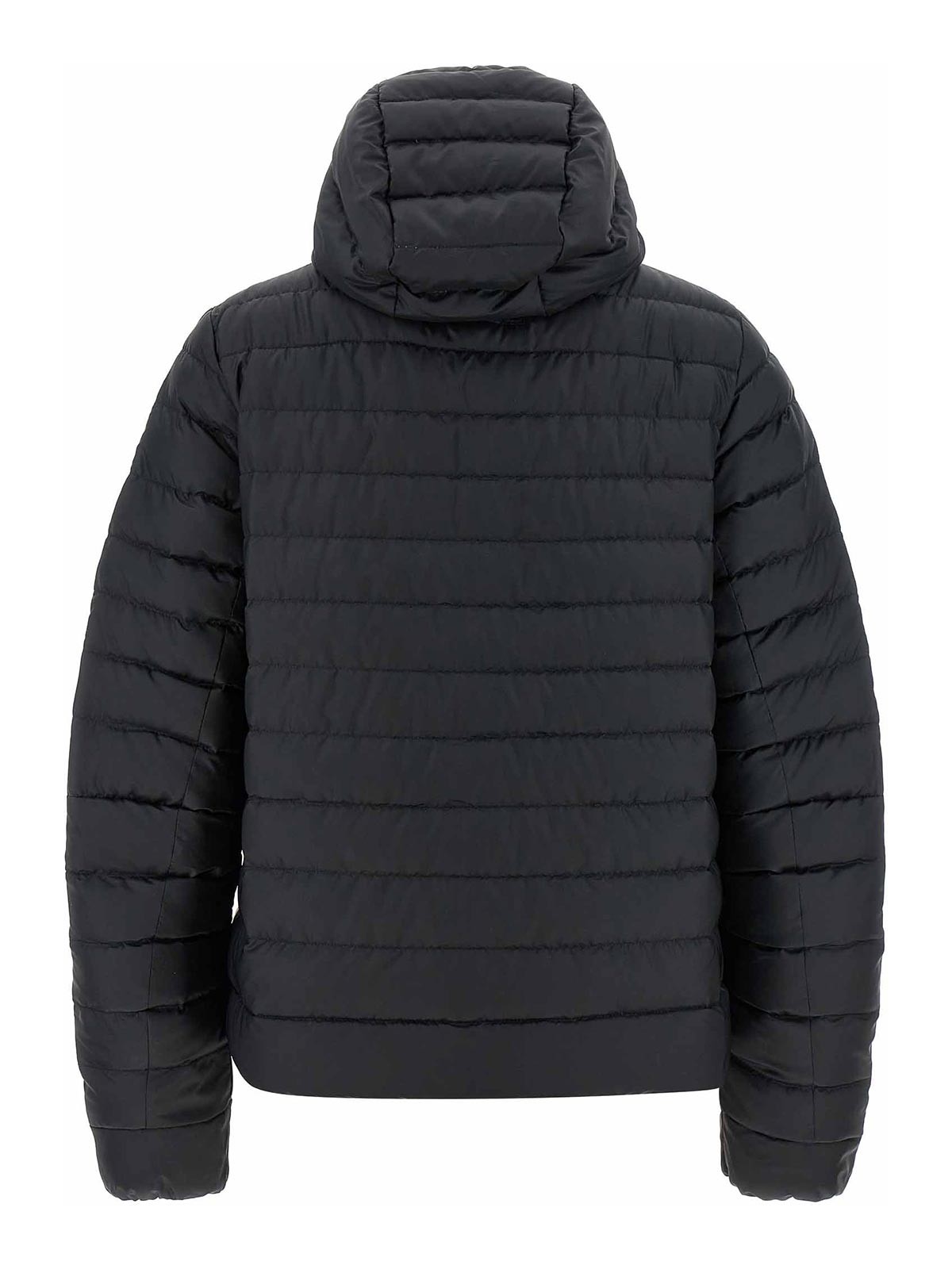エーセラの撥水加工ダウンジャケットはリップストップ構造で、キルト加工とわずかにグースフェザーのパッド、フード、フロントジッパー、ポケット、伸縮性のある袖口とトーン・オン・トーンのロゴパッチアップリケが付いたロングスリーブ、裾にドローストリング、右ポケットに折り畳み可能。