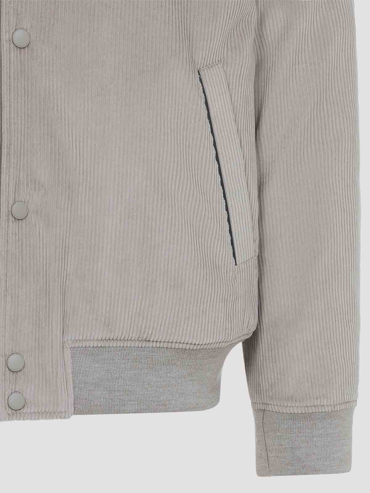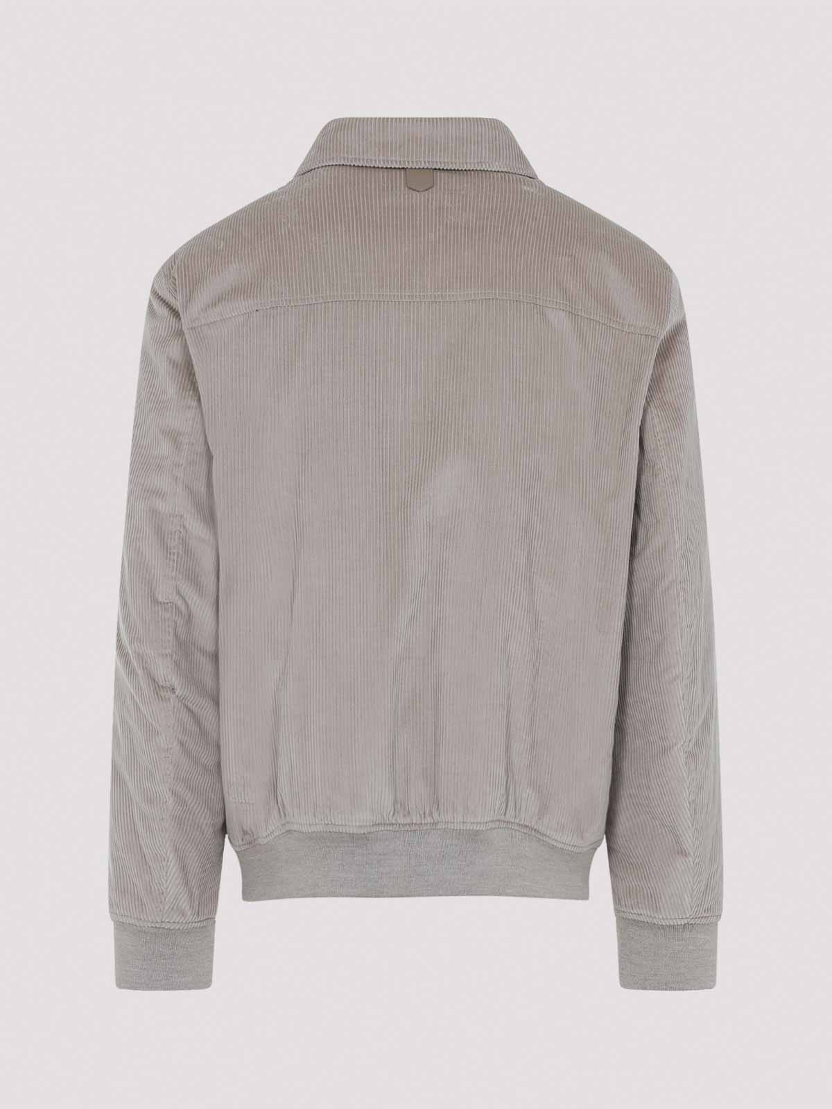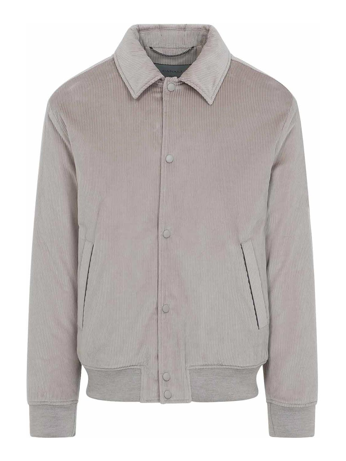 カナーリベルベットベージュコットンジャケット。ライトベージュのコットンコーデュロイ製、ポインテッドカラー、スナップボタン留め、フロントポケット2つ、ロングスリーブ、バックヨーク、襟の後ろにレザーミニラベル、リブ編みの袖口と裾に裏地付き。