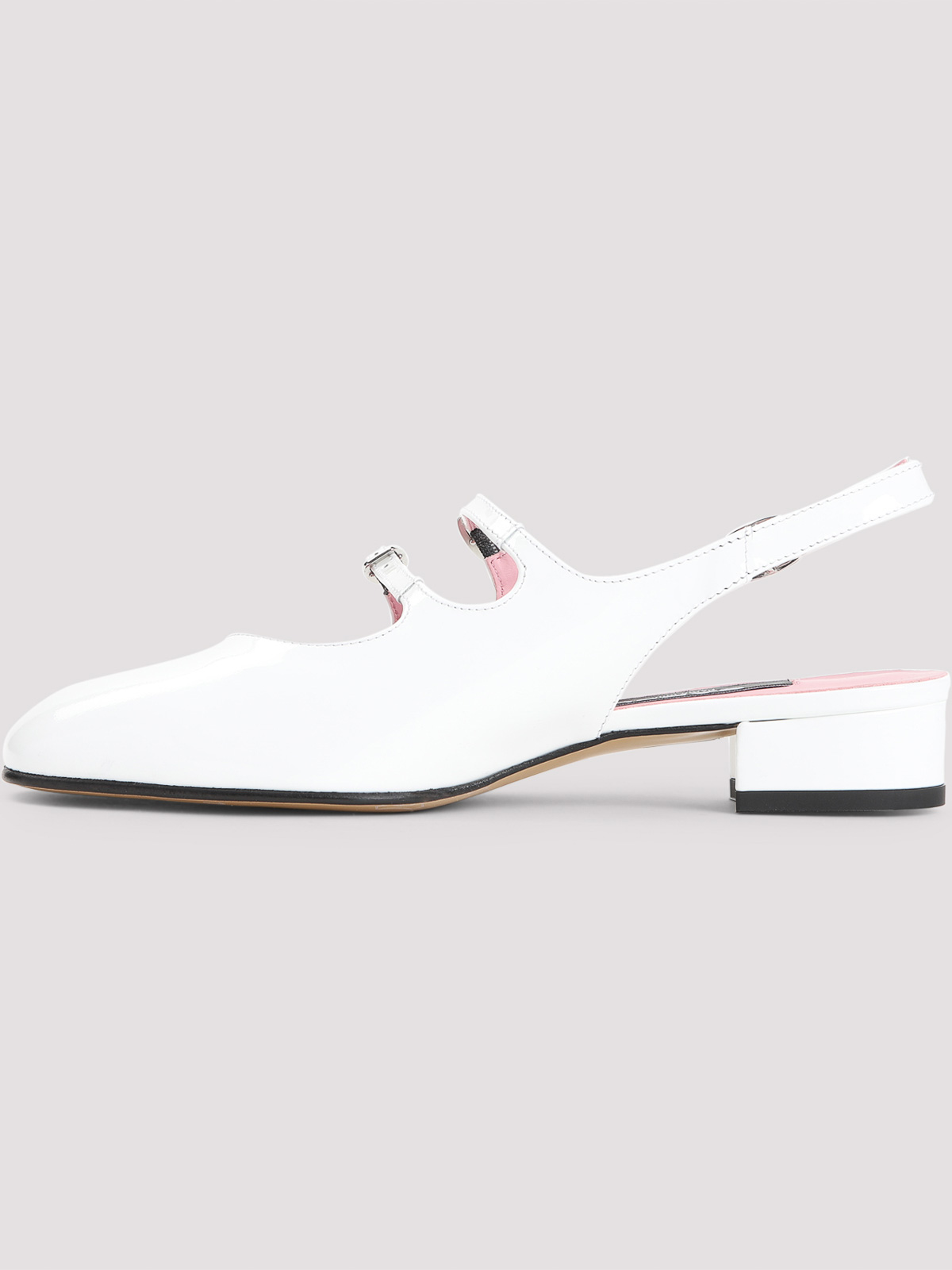 Carel Pecheのホワイトパテントレザー製ミュール。ホワイトパテントレザー製、スクエアアーモンドトウ、バックル付きトップアジャスタブルストラップ、オープンバック、背面に調節可能なストラップ、レザーの裏地とインソール、ブロックヒール、レザーアウトソール。