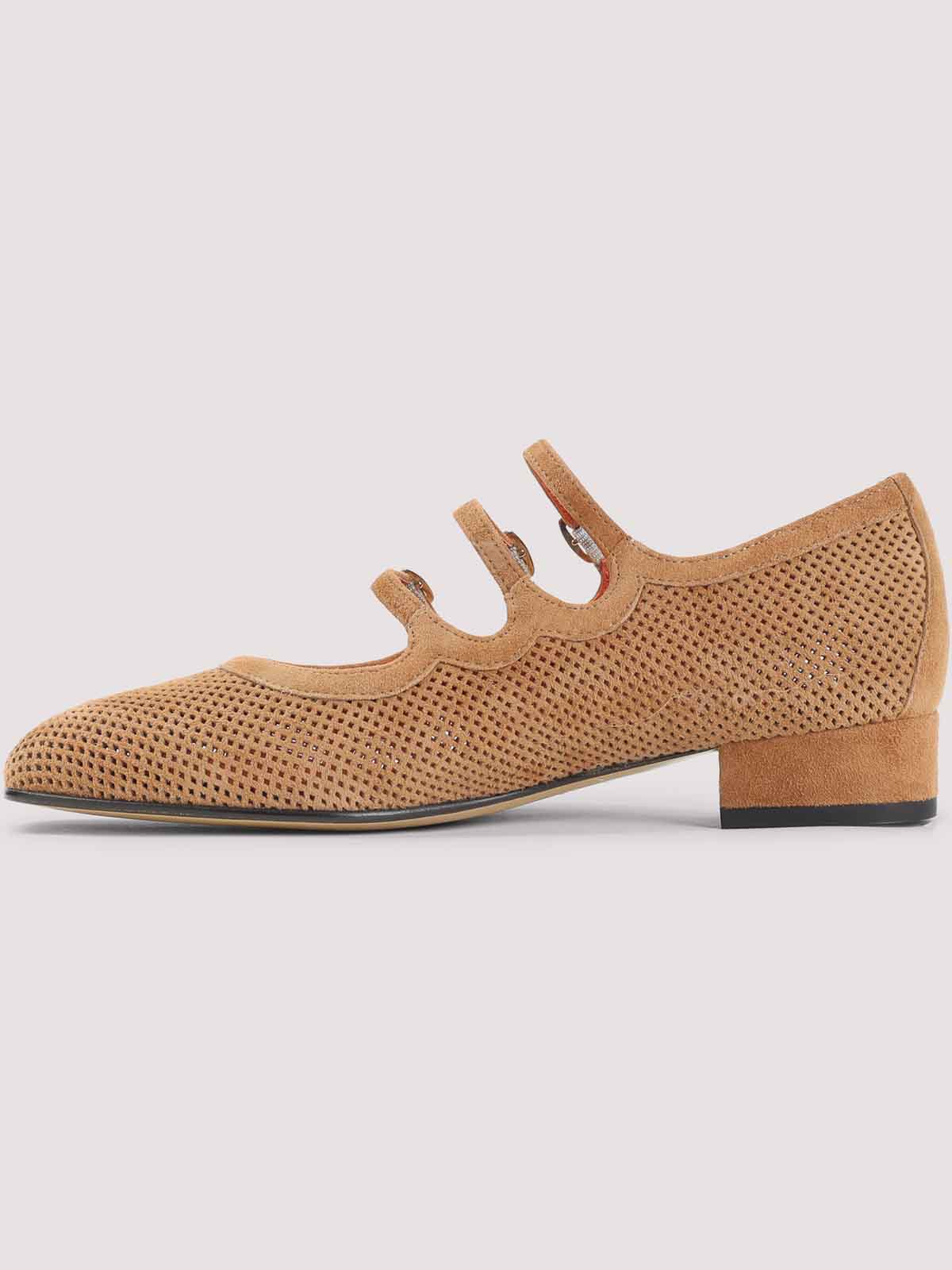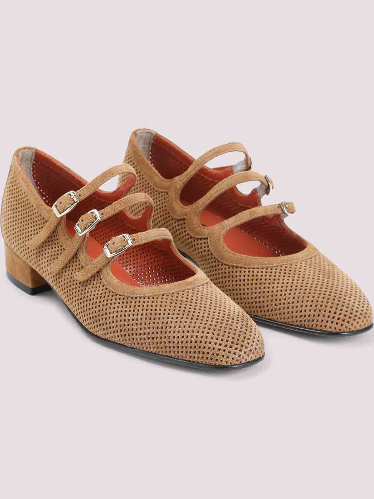 Carel paris タンブラウンスエードレザーアリアナスプリットスエードメリージェーンパンプス。ピュアタンブラウンスエードレザーパンプス、アーモンドトウ、サイドゴールドトーンバックル付きトップアジャスタブルトーンストラップ、インナーレッドライニング、ワイドヒール、レザーソール。アッパーに穴あきディテール。