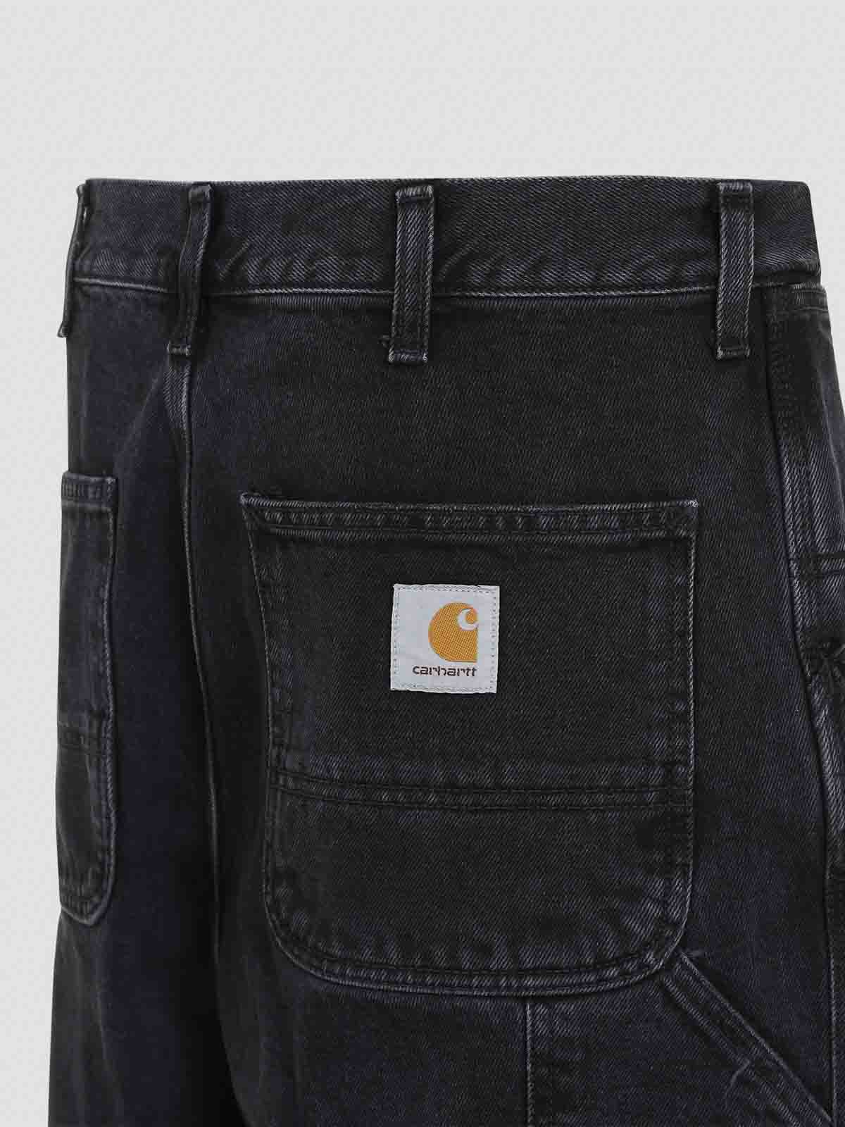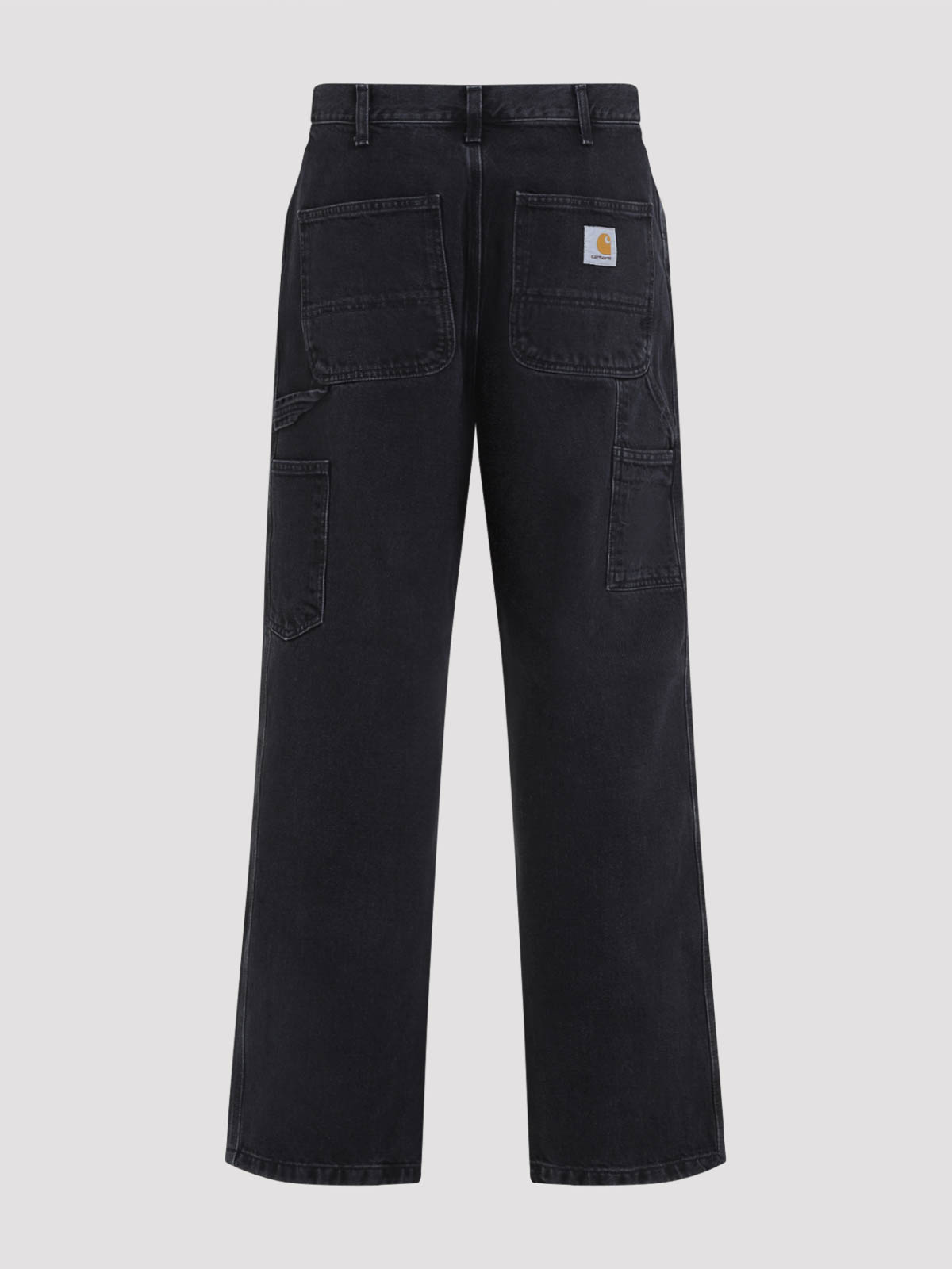 Carhartt WIP シングルニーブラックコットンジーンズ。ウォッシュ加工のブラックコットンデニム製、ミッドウエスト、ベルトループ、フロントボタン、フライジップクロージャー。フロントポケット、ブランドラベルのディテールが施されたパッチポケット2つ。サイドにツールポケットとハンマーループ1つ、リラックスできるストレートフィット。