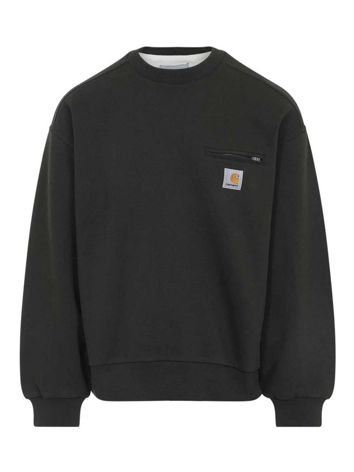 Carhartt wip デトロイトグリーンのスウェットシャツ。ラウンドネック、ファスナーポケット、胸にスクエアロゴパッチ、ドロップショルダー、ロングスリーブ、リブ編み、裏地付き、バルーンフィット