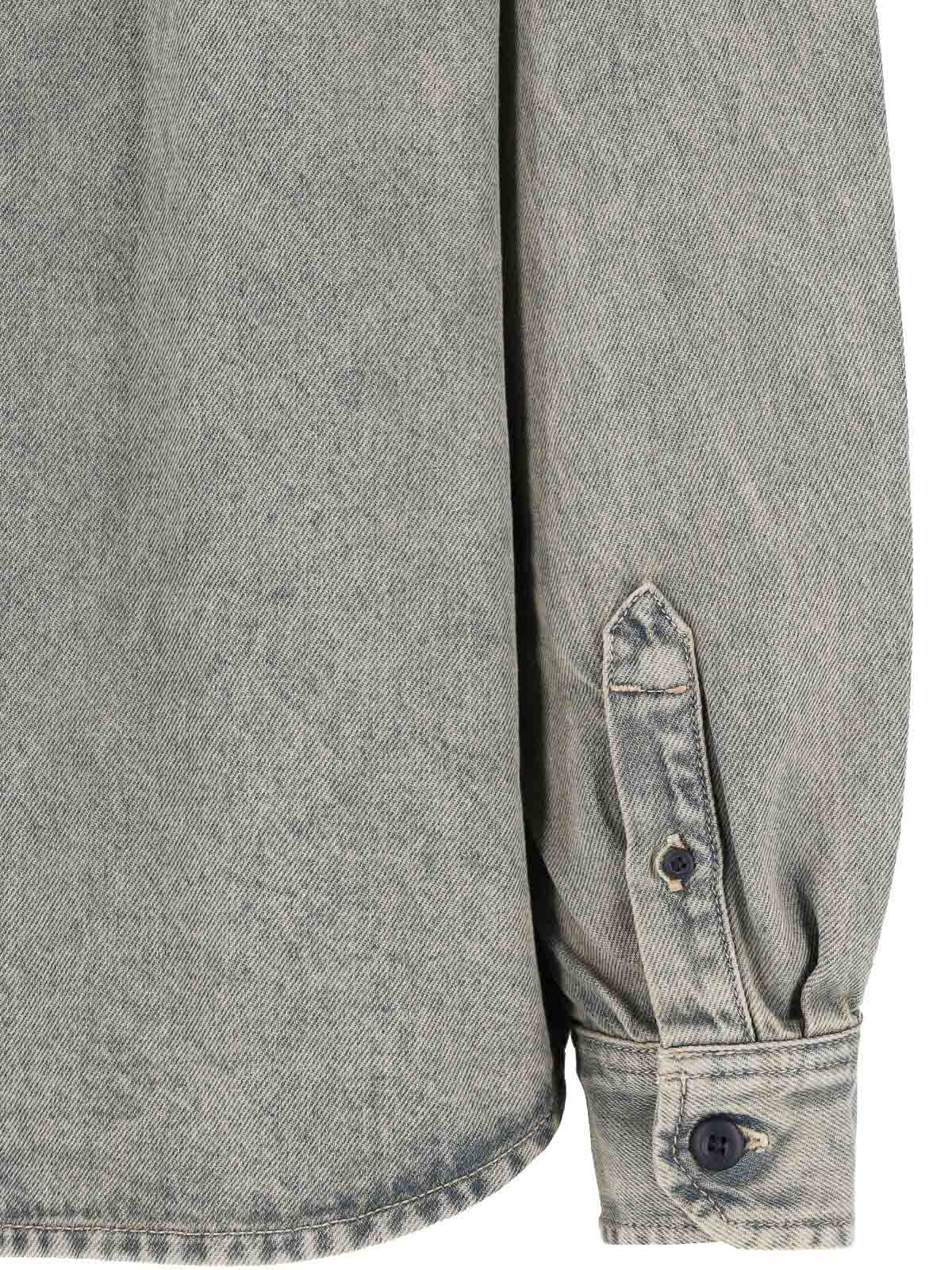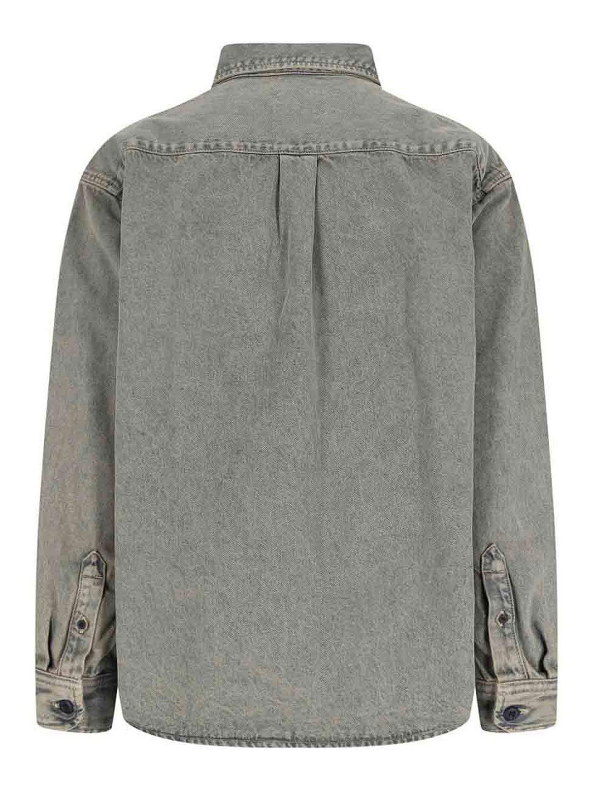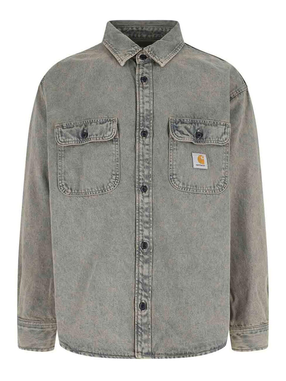 Carhartt wip tigan デニムシャツジャケット、グレー、ウォールドウォッシュ、クラシックカラー、ボタン留め、胸にボタン付きフラップポケット2つ、ロゴラベルのディテール、ボタン付きカフス、ストレートヘム。