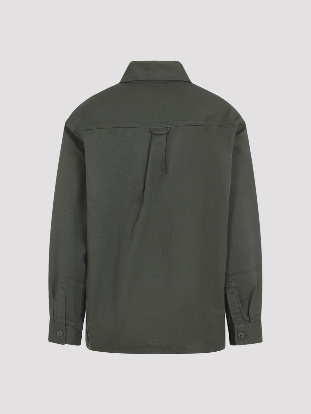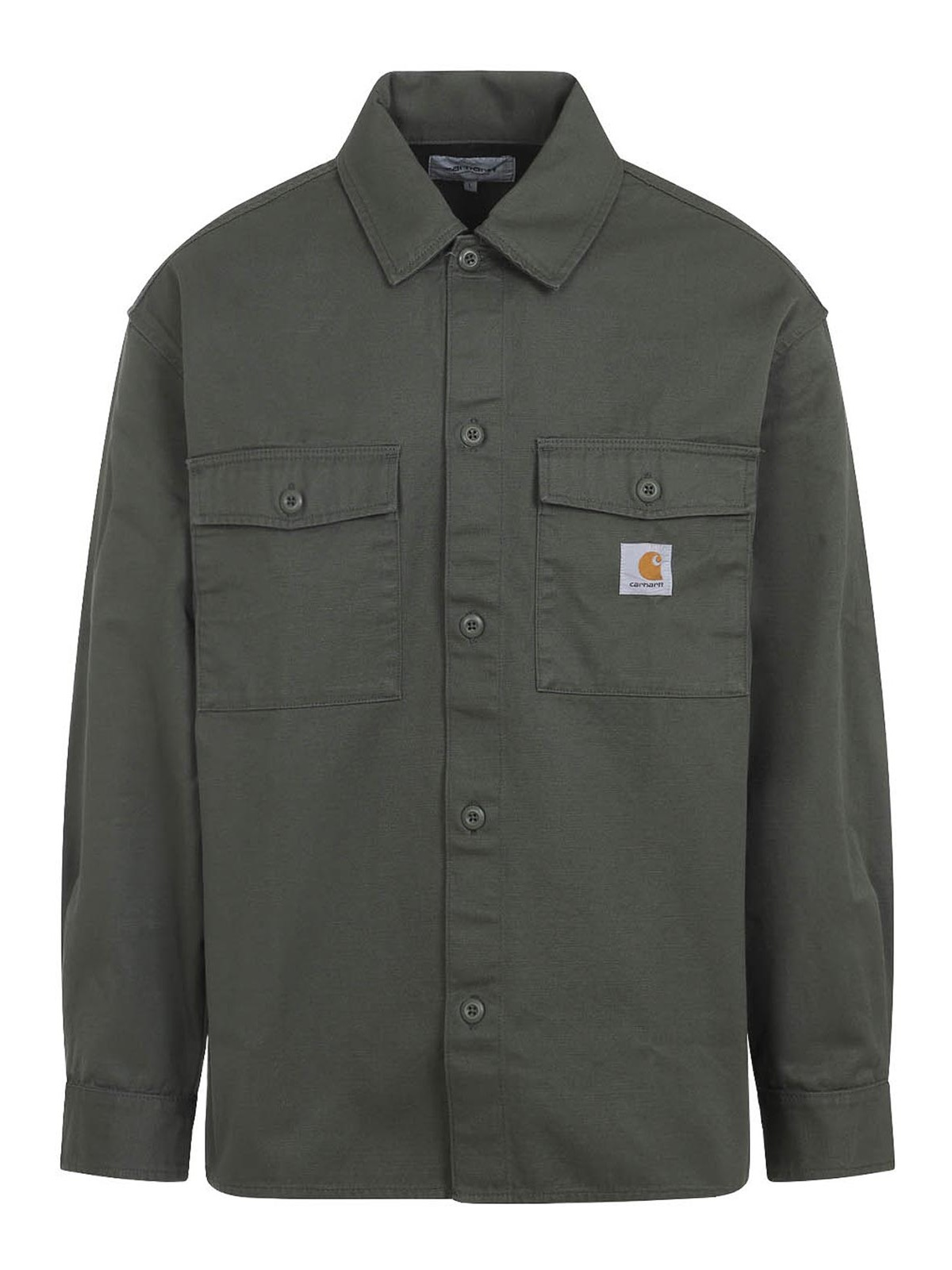 カーハートウィップケリーシャツグリーンコットンジャケット。グリーンコットン製、ポインテッドカラー、フロントボタン留め、胸にロゴパッチのディテールが施されたフラップポケット2つ、ボタン付きカフス付きロングスリーブ、バックヨークとボックスプリーツ、ラウンドヘム。