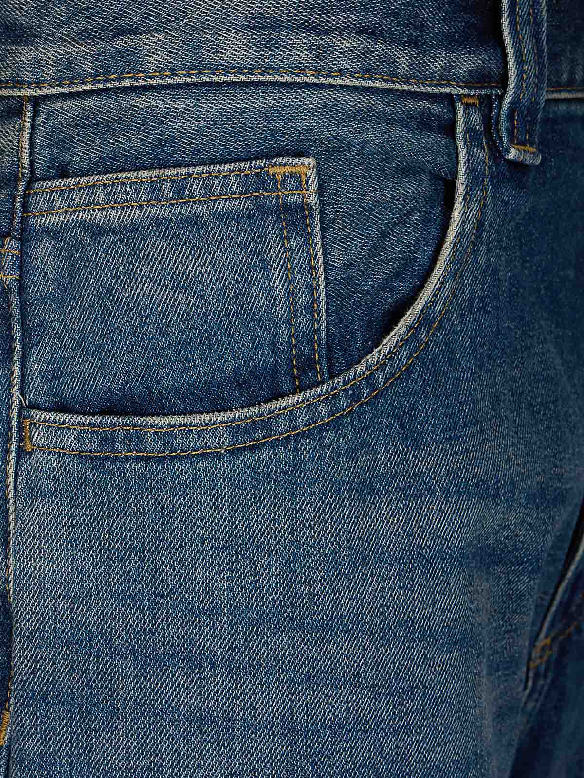 ルーズストレートフィットジーンズ、ロークロッチ、ジップフライ、ミディアムダークウォッシュ、ストレートレッグ。