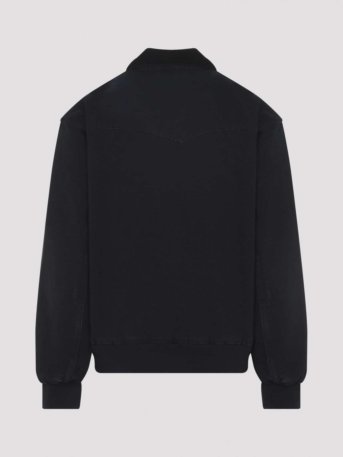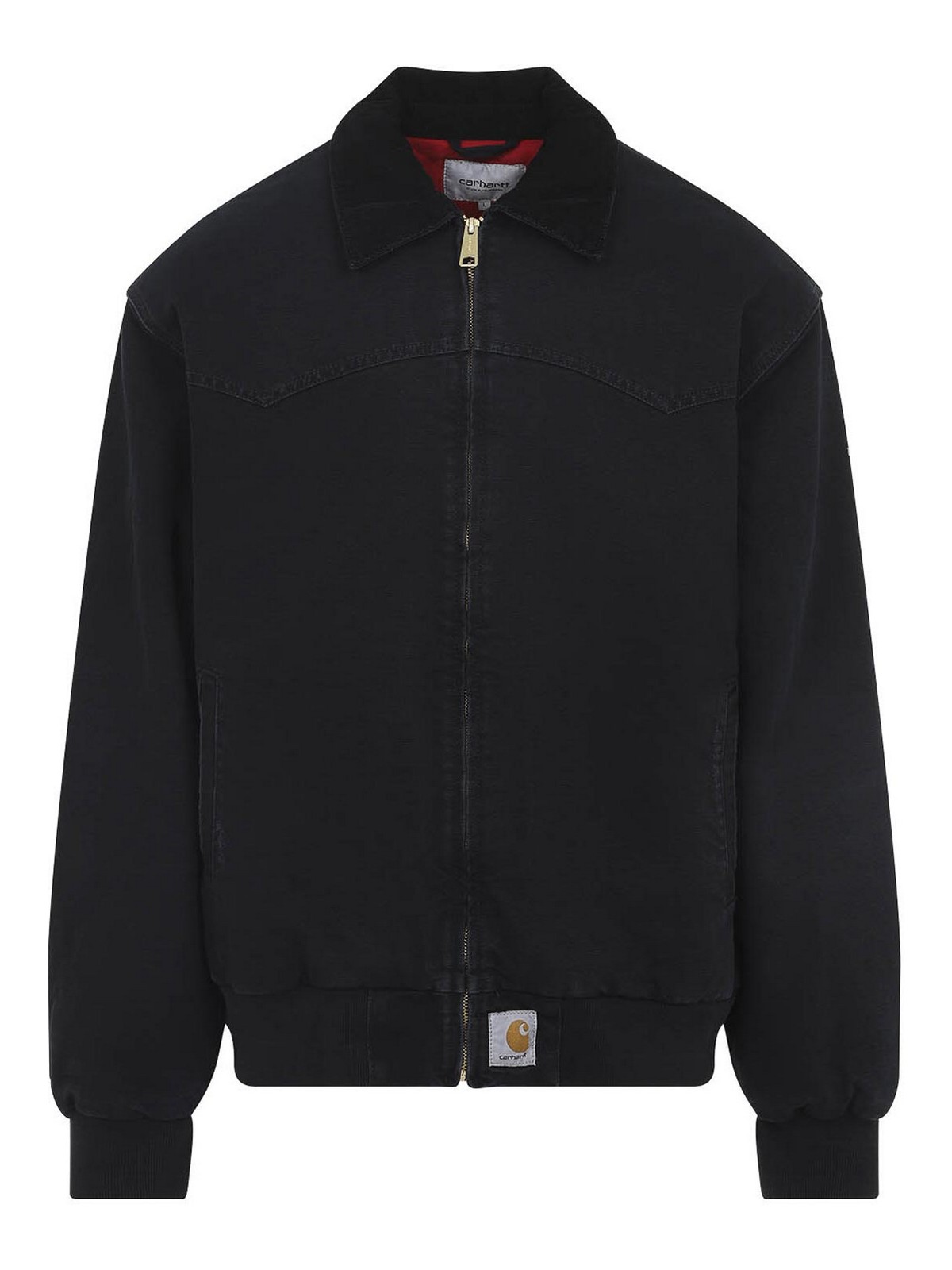 カーハートウィップブラックコットンとサンタフェジャケット。ピュアブラックコットンジャケット、ポインテッドトーナルカラー、フロントファスナー、サイドポケット、ロングスリーブ、リブ編みの袖口と裾、裾にパッチロゴ、ストレートヘム、総裏地。