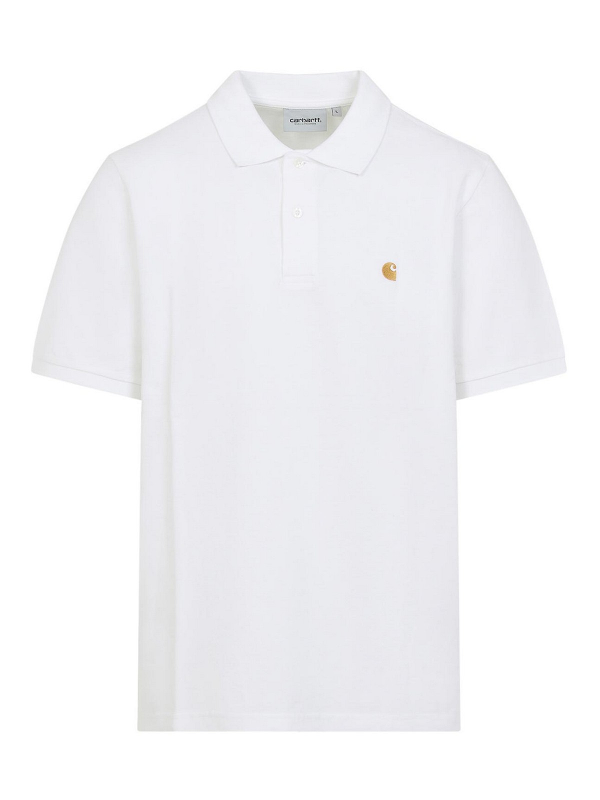 カーハートウィップホワイトコットンショートスリーブチェースピケポロ。ピュアホワイトコットンポロ、クラシックポロカラー、チェストゴールド刺繍ロゴ、ショートスリーブ、ストレートヘム。
