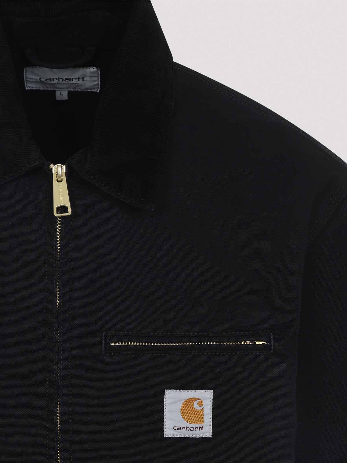 カーハートウィップブラックコットンデトロイトジャケット。ピュアブラックコットンジャケット、先のとがったリブ編みの襟、フロントファスナー、胸にジッパー付きポケット、胸にパッチロゴ、サイドポケット、長袖、ストレートヘム、総裏地。