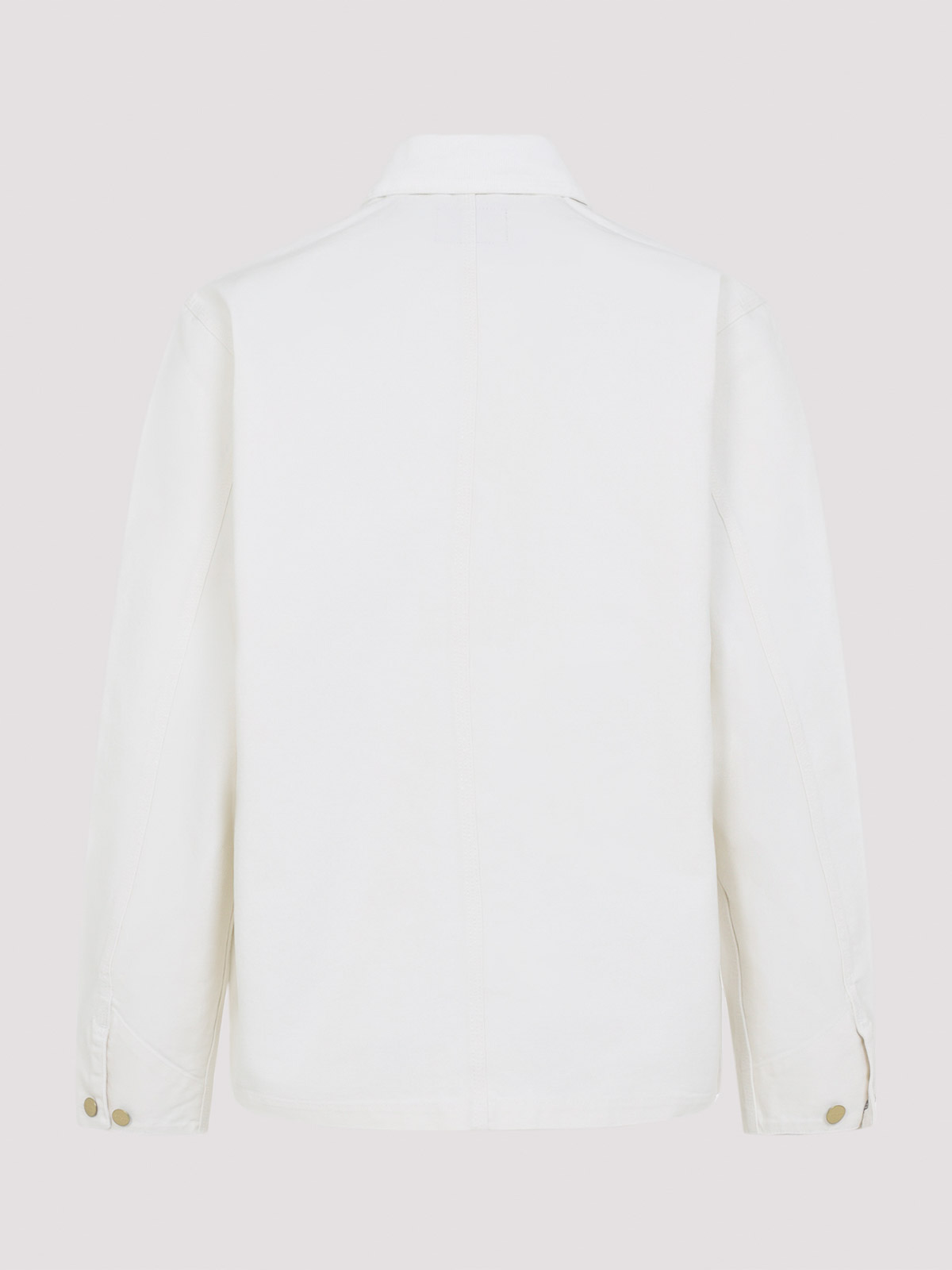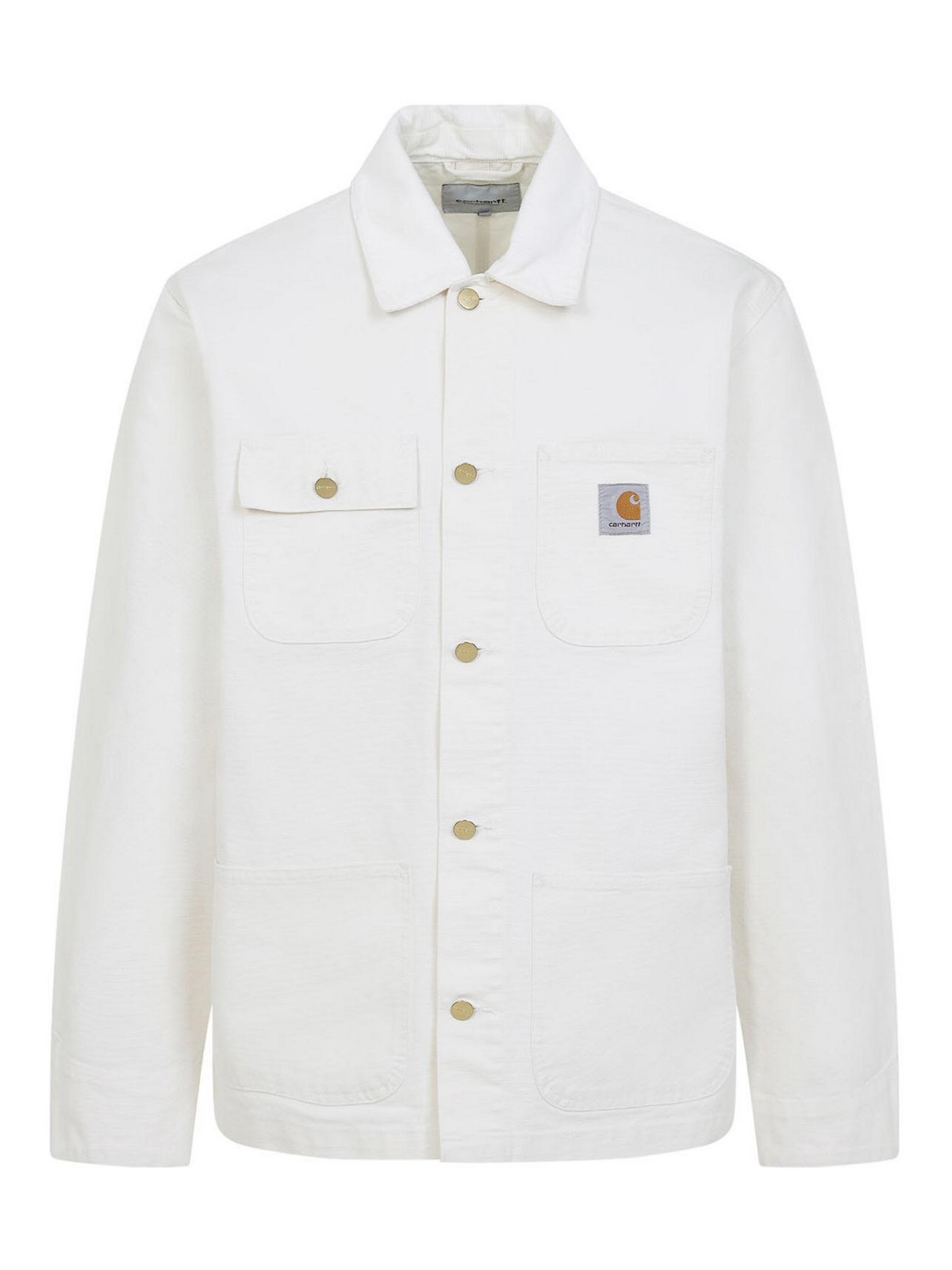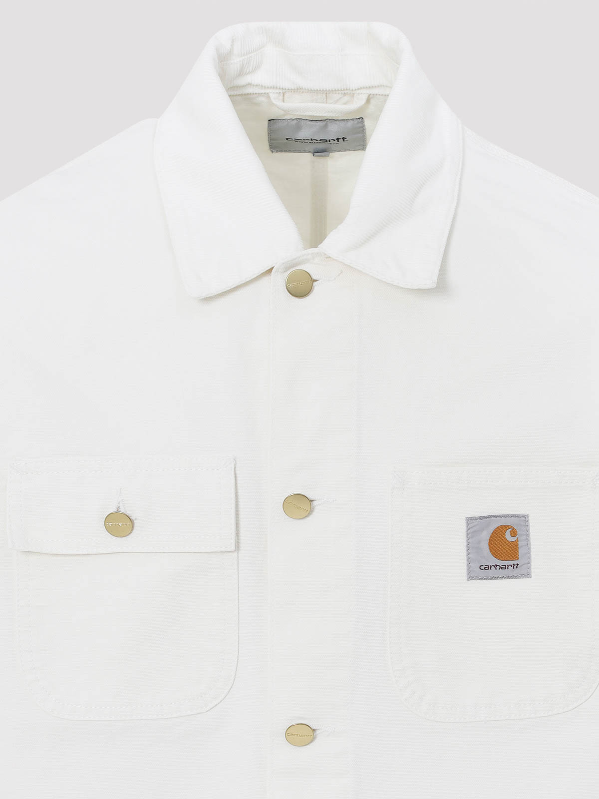 カーハートウィップワックスホワイトコットンミシガンコート。ピュアワックスホワイトコットンジャケット、ポインテッドカラー、フロントボタン留め、パッチロゴ入り胸パッチポケット、胸パッチフラップボタンポケット、サイドポケット、長袖、ボタン付きカフス、ストレートヘム。