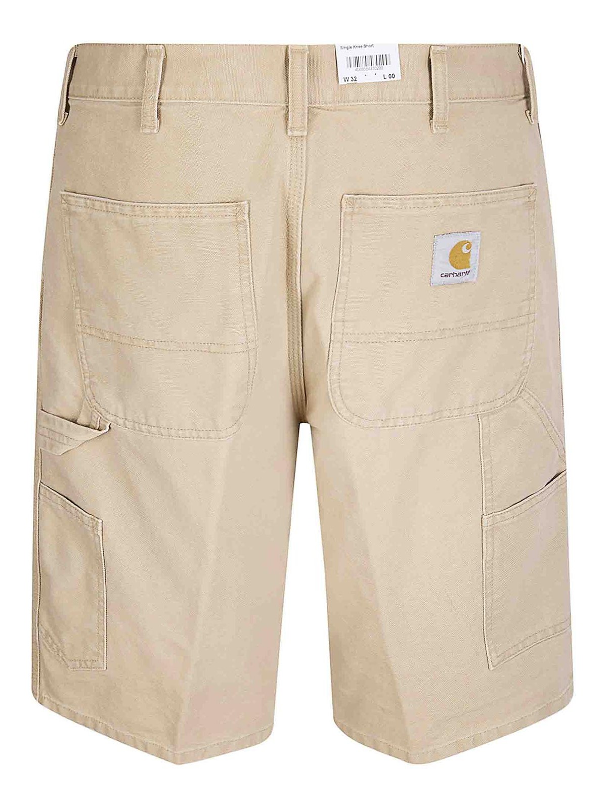 ファスナーとボタン留めのショートパンツ、サイドポケット2つ、バックポケット2つ、レッグポケット1つ、背面にロゴラベルのディテール。