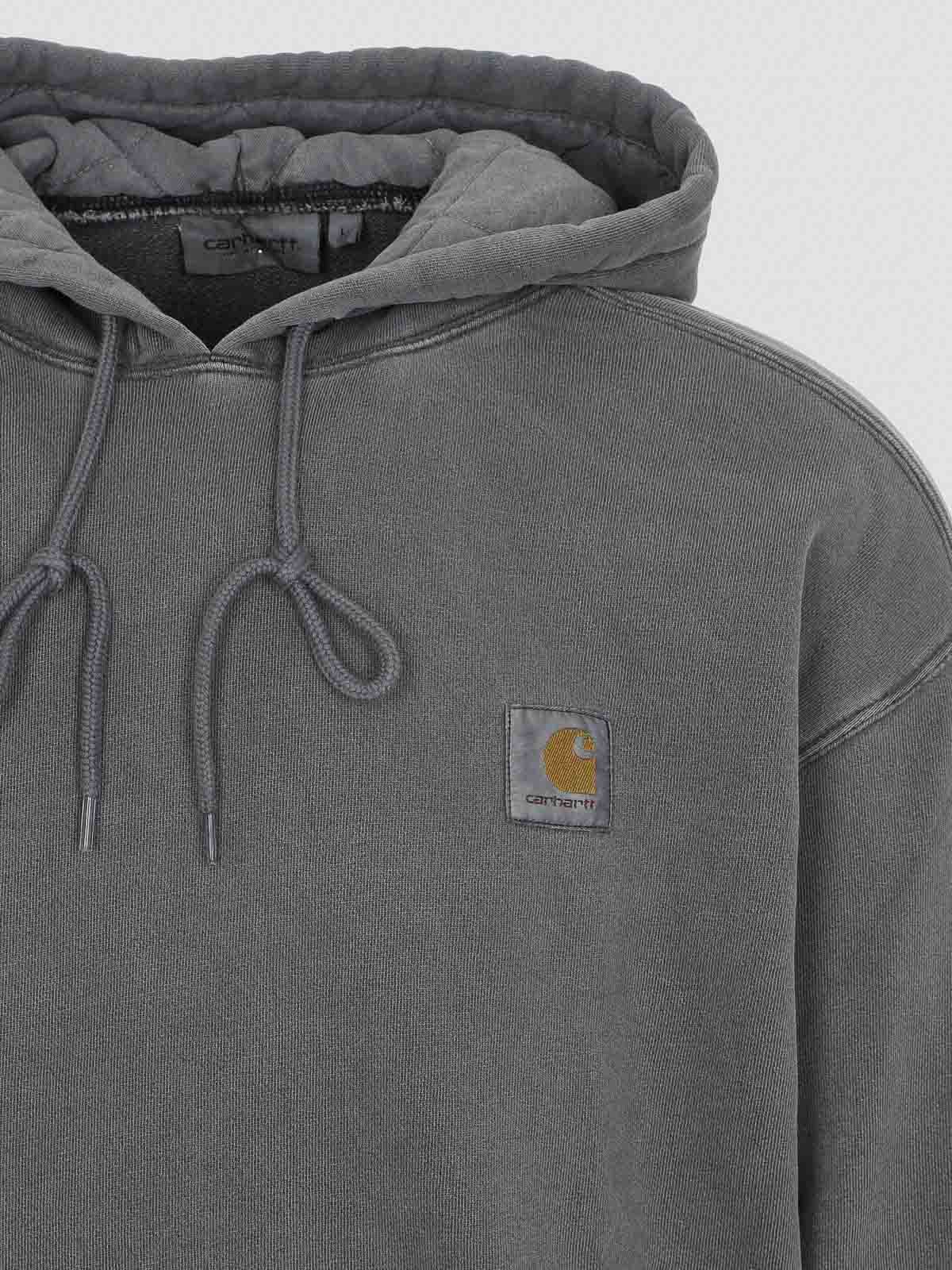 カーハートウィップブラックフード付きネルソンスウェットシャツ。ピュアブラックコットン製。ドローストリング付きフード、長袖、リブ編みの裾と袖口、フロントにカンガルーポケット、胸にカーハートウィップのロゴ、ストレートヘムが付いています。